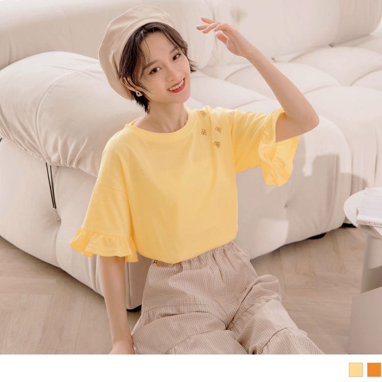 RUFFLE SLEEVE ROUND NECK EMBROIDERED TOPS