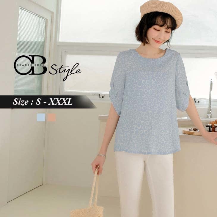 ROUND NECK PRINTED PUFF SLEEVE BOWKNOT TOPS