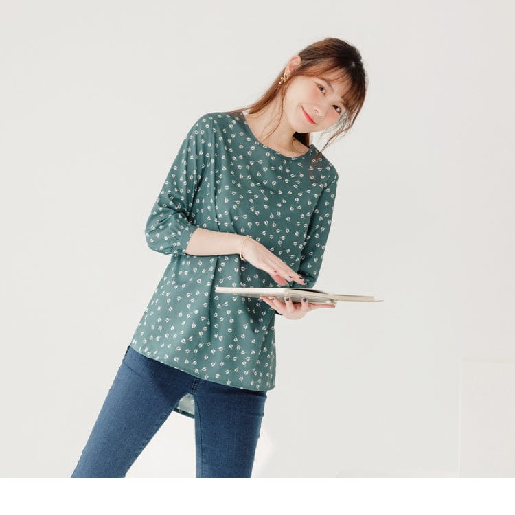 ROUND NECK 3/4 SLEEVE DIP HEM PRINTED TOPS