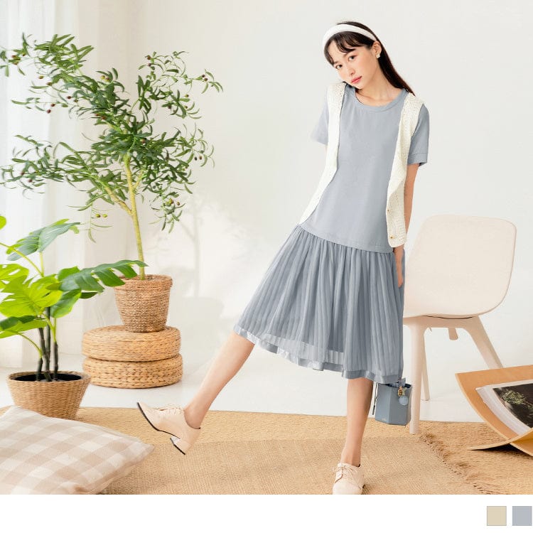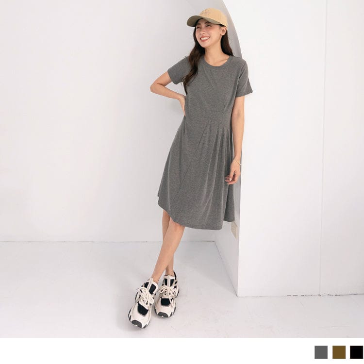 PURE COLOR ROUND NECK A-LINE PLEAT DRESS