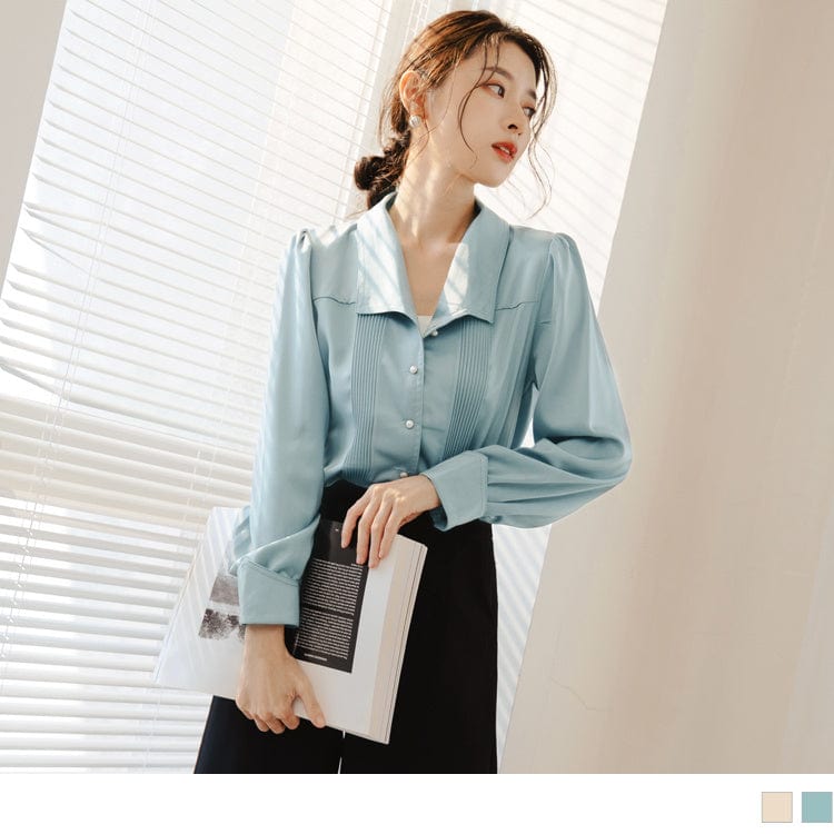 PURE COLOR V-NECK SUIT COLLAR RUCHED LONG SLEEVE TOPS