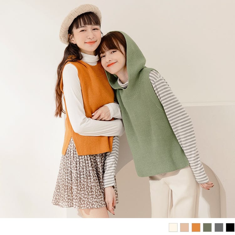 PIT STRIPE HOODED KNIT SLEEVELESS HOODED FUR TOPS