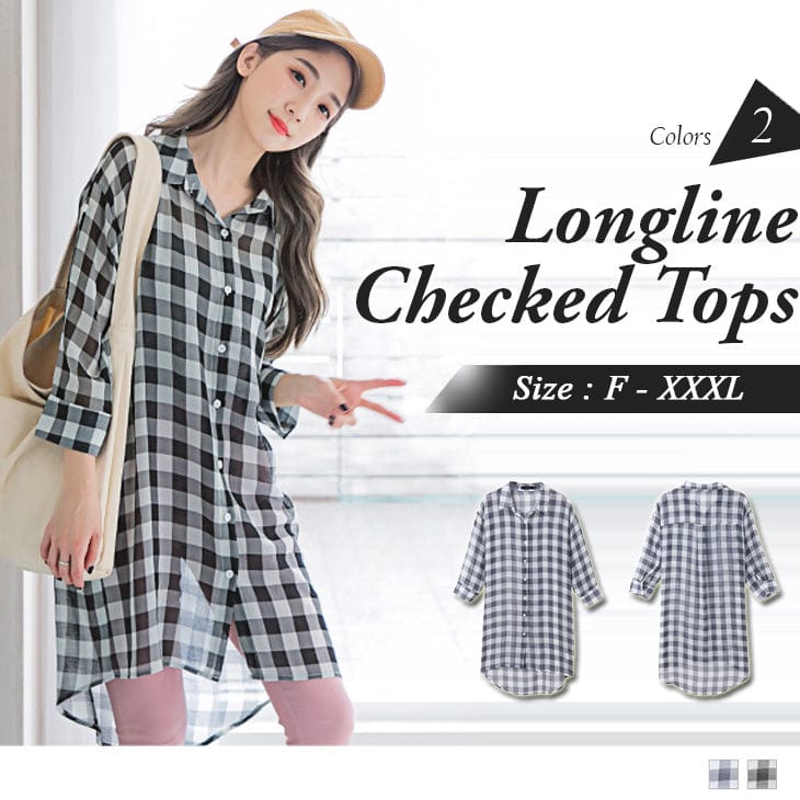LONG SLEEVE CHIFFON CHECKED LONGLINE TOPS