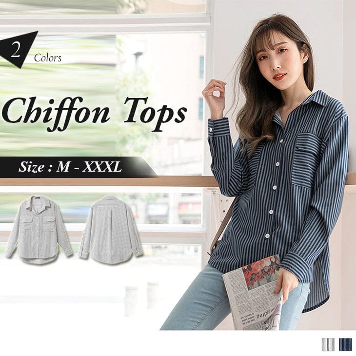 LONG SLEEVE STRIPED BUCKLE CHIFFON TOPS