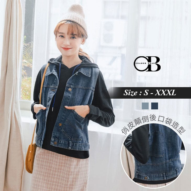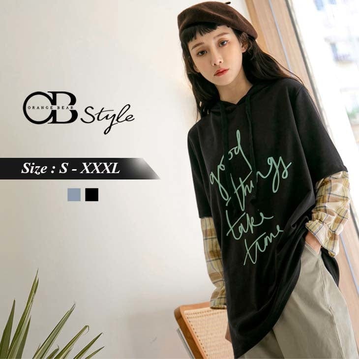 LONGLINE FAKE TWO PIECE CHECKED PATCHED HOODED TOPS