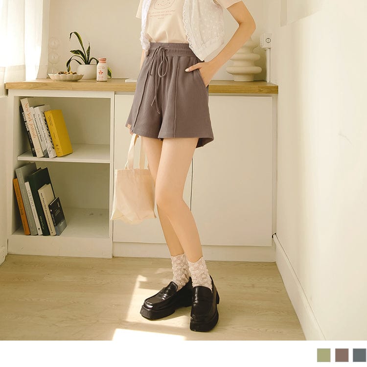 MEDIUM WAIST WAFFLE CHECKED CASUAL WIDE LEG SHORTS