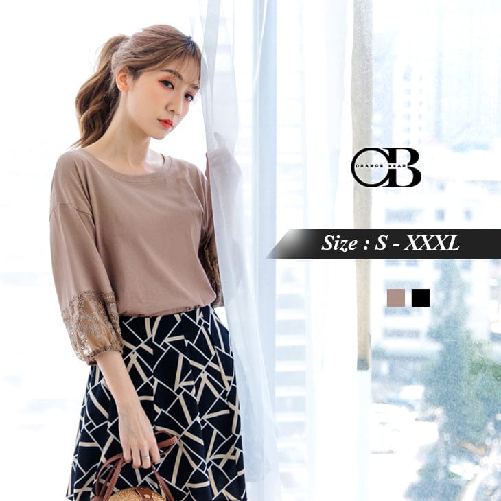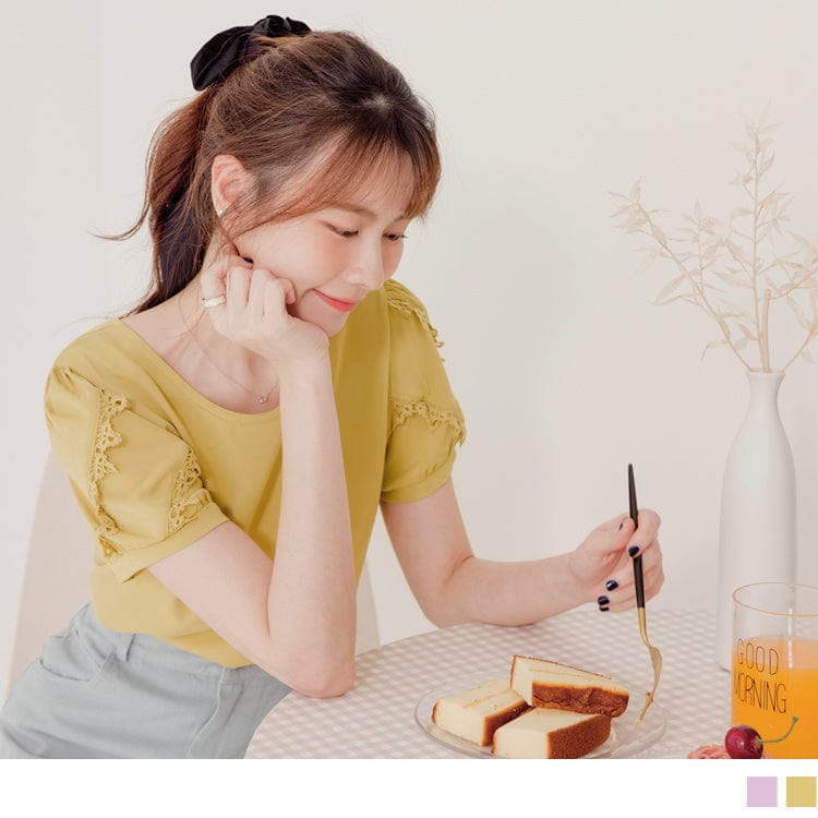 LACE PUFF SLEEVE ROUND NECK TOPS