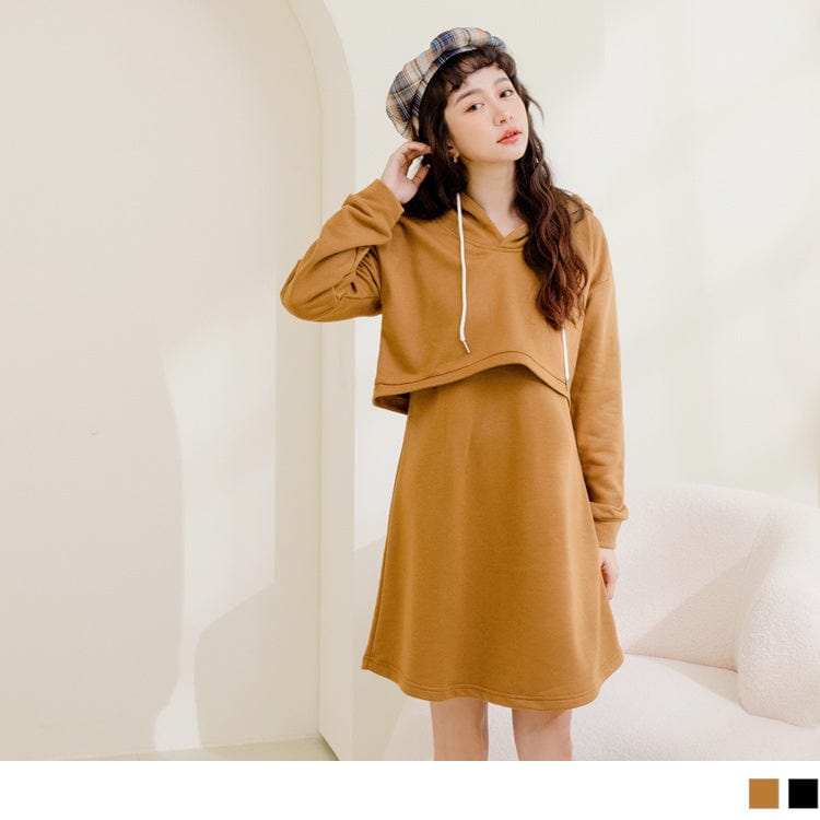LAYERED-LOOK HOODED LONG SLEEVE MIDI DRESS