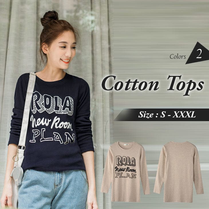 LETTER PRINTED ROUND NECK LONG SLEEVE COTTON TOPS