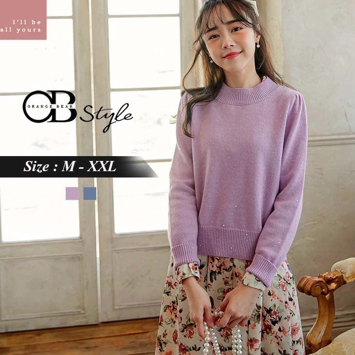 HIGH NECK LONG SLEEVE PUFF SLEEVE PLAIN KNIT FUR TOPS