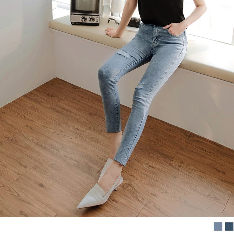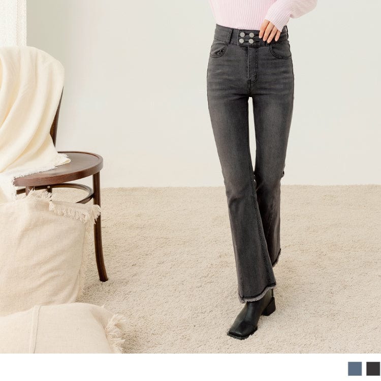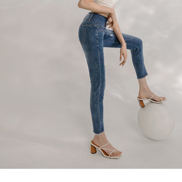 HIGH WAIST FRAYED HEM BUTTONS SKINNY DENIM PANTS