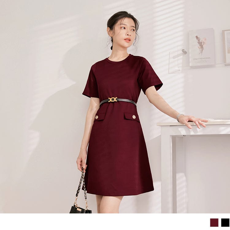 HIGH WAIST SLIM ROUND NECK SHORT SLEEVE MIDI DRESS