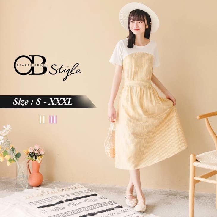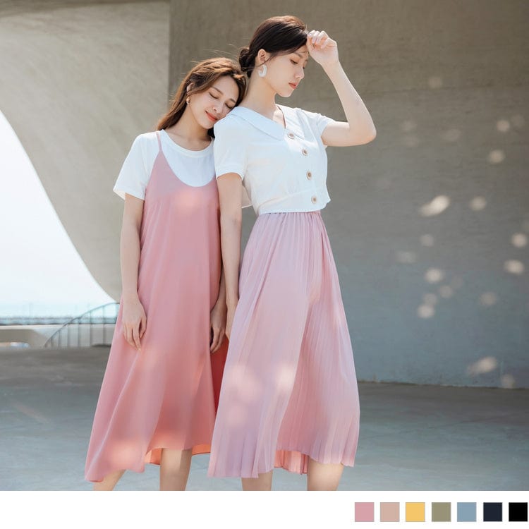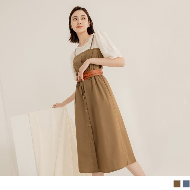 FAKE TWO PIECE ELASTIC WAIST ROUND NECK MIDI DRESS