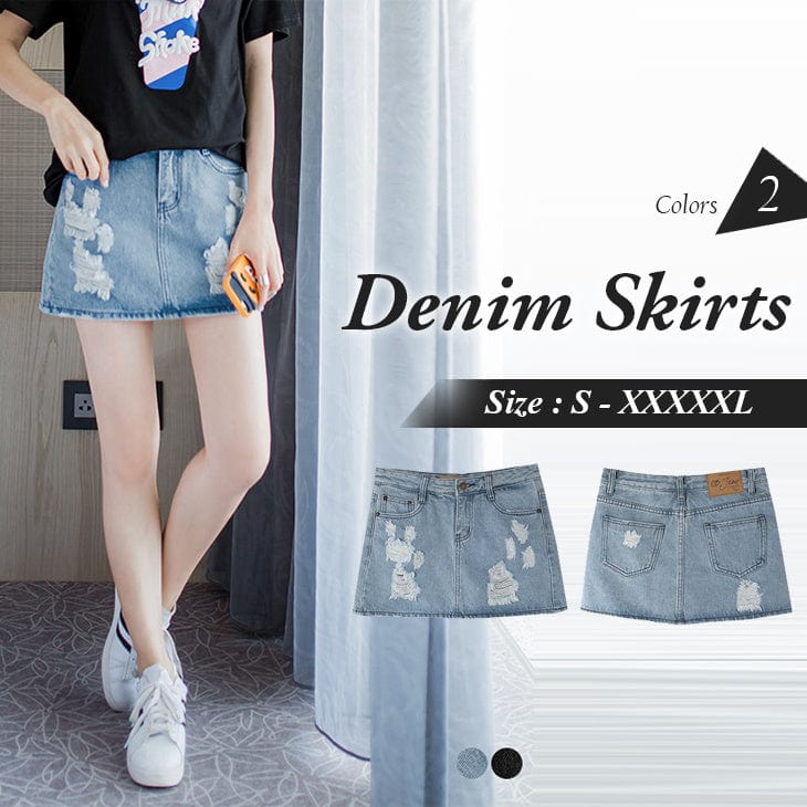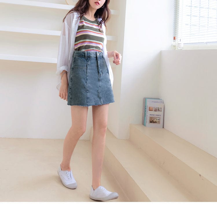 FRAYED HEM HIGH WAIST A-LINE DENIM SKIRTS
