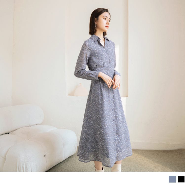 FLORAL PRINTED LONG SLEEVE ELASTIC WAIST MAXI DRESS