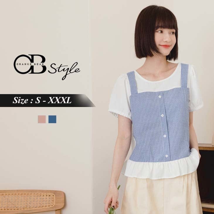 FAKE TWO PIECE CHECKED PATCHED RUFFLE HEM TOPS
