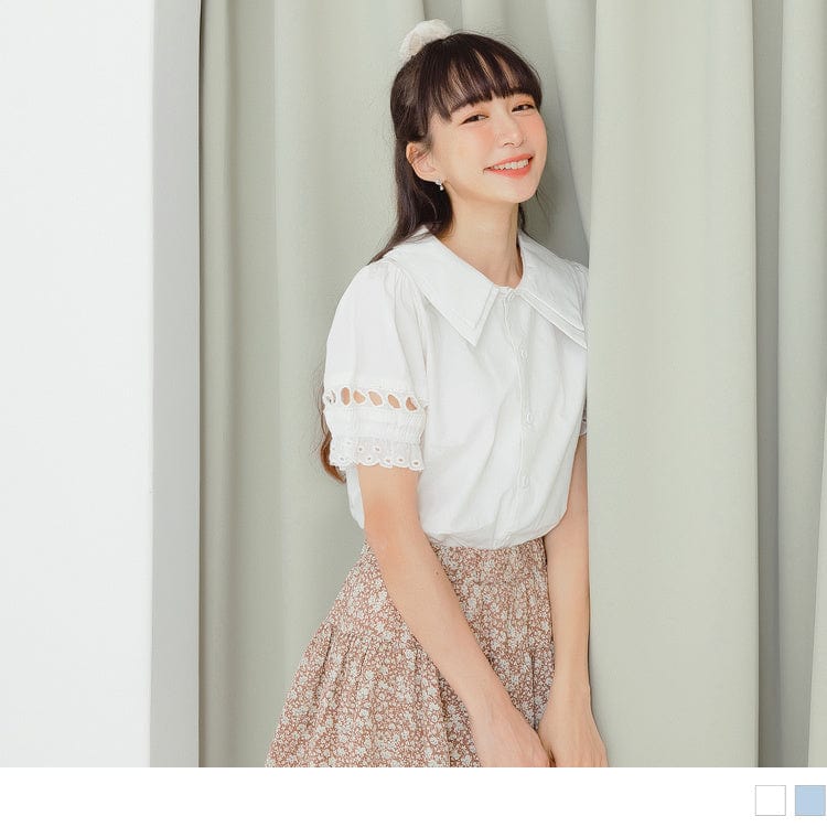 ELEGANT COTTON HOLLOW OUT LACE PUFF SLEEVE TOPS