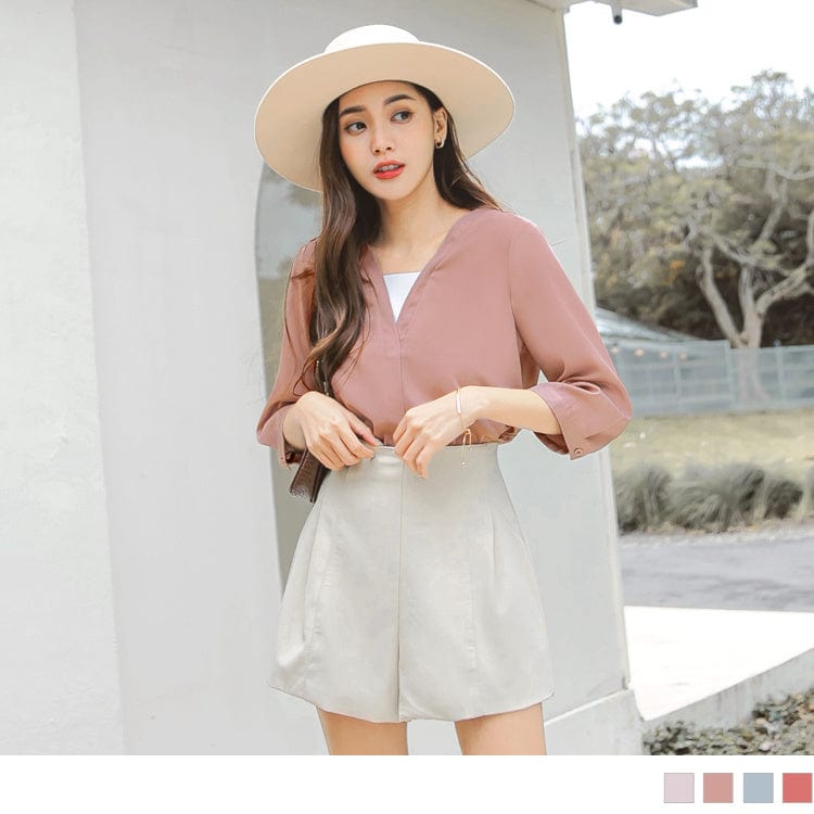 FAKE TWO PIECE 3/4 SLEEVE V-NECK CHIFFON TOPS