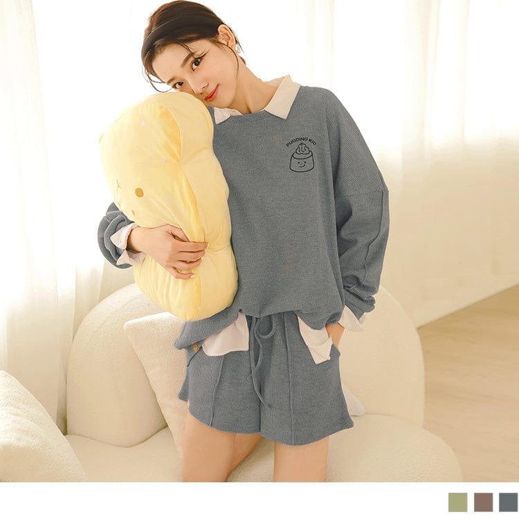 EMBROIDERED WAFFLE CHECKED DROP SHOULDER LONG SLEEVE TOPS