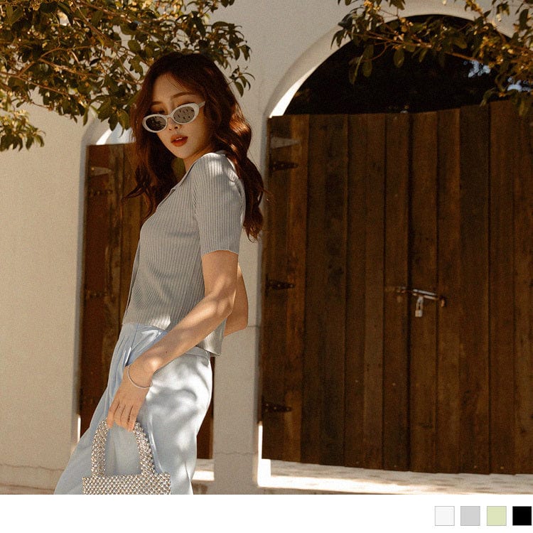 ELEGANT V-NECK PIT STRIPE CROP SHORT SLEEVE TOPS