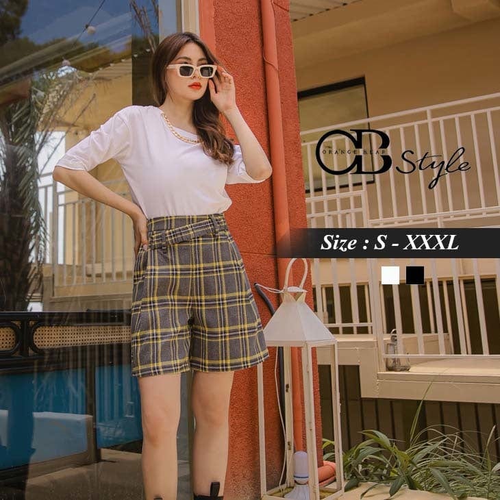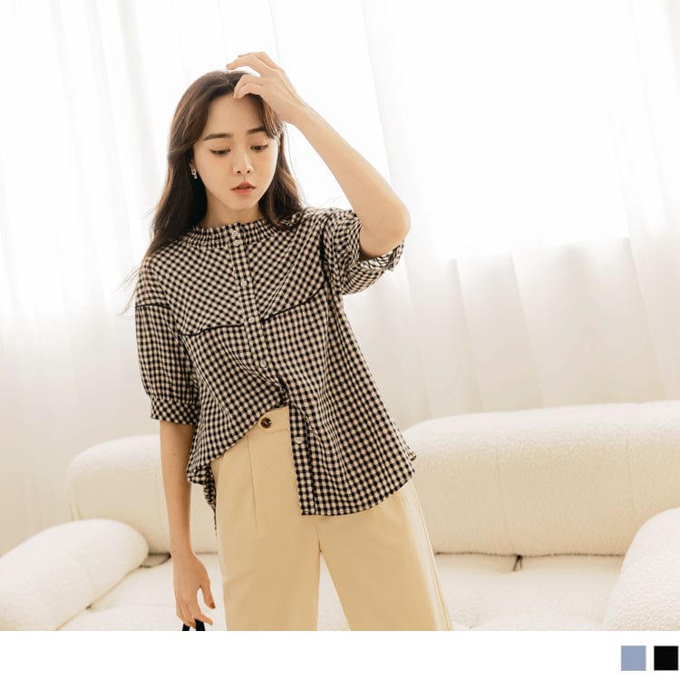 ELASTIC COLLAR CHECKED BUTTONS SHORT SLEEVE TOPS