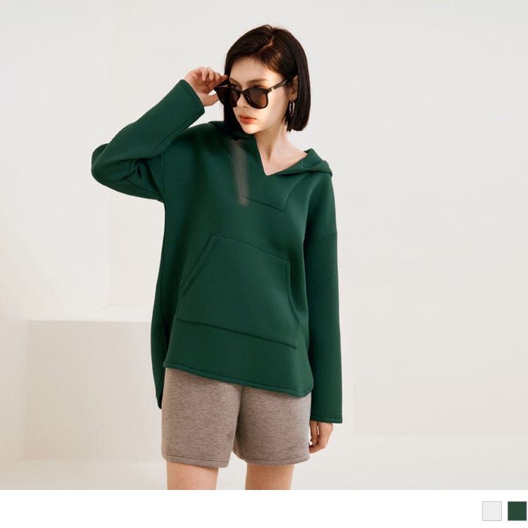 DROP SHOULDER V-NECK LONGLINE HOODED TOPS