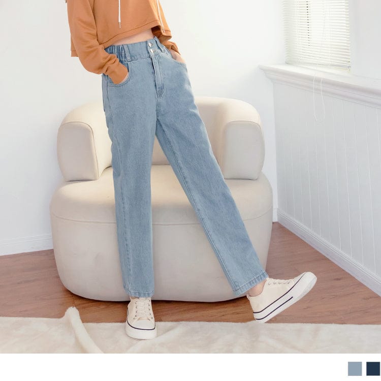 ELASTIC WAIST BUTTON COTTON STRAIGHT DENIM PANTS