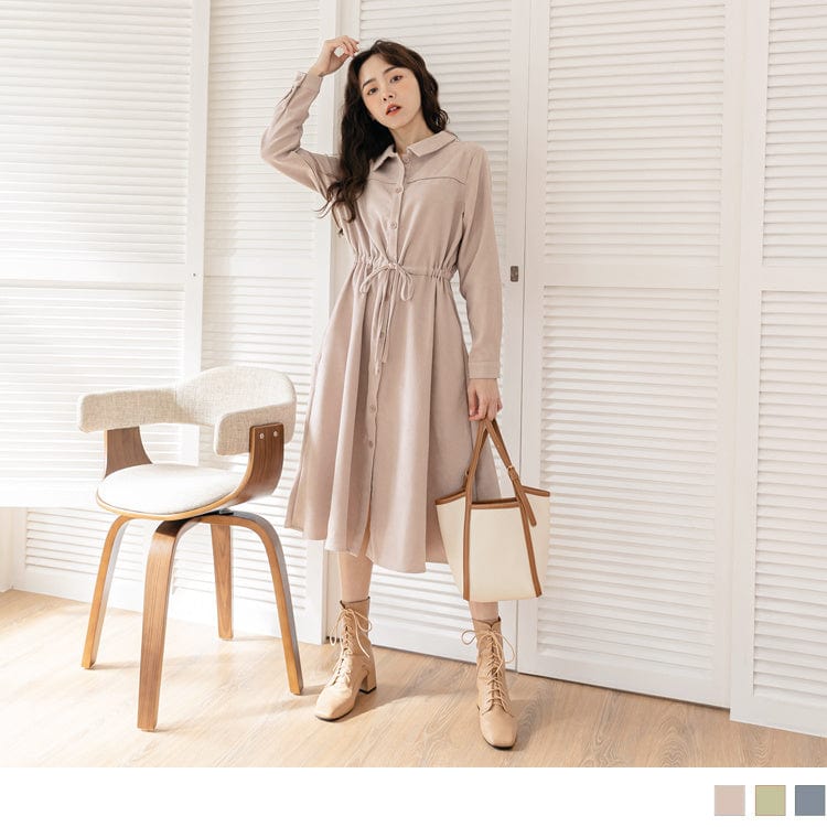 DRAWSTRING WAIST SHIRTS COLLAR A-LINE MAXI DRESS