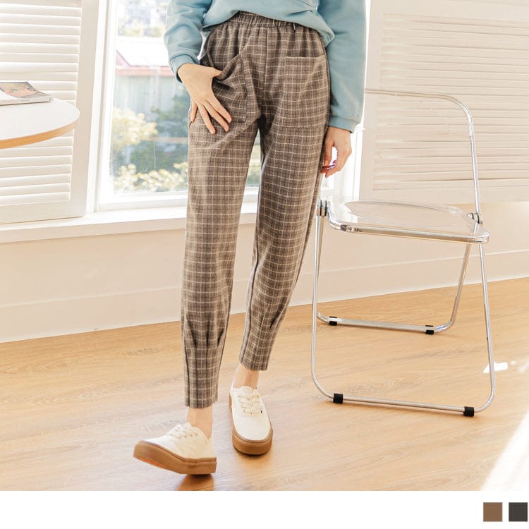 ELASTIC WAIST CHECKED WOOLEN HAREM LONG PANTS