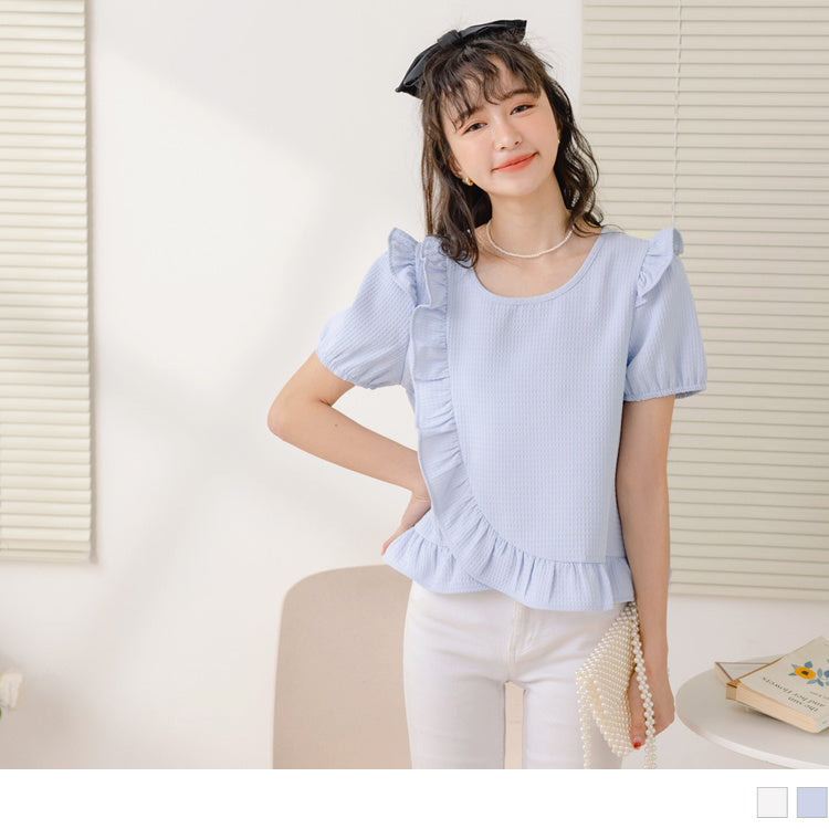 CHECKED RUFFLE PUFF SLEEVE ROUND NECK TOPS