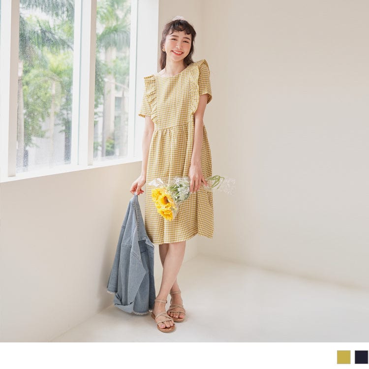 CHECKED RUFFLES PATCHED SHORT SLEEVE MIDI DRESS