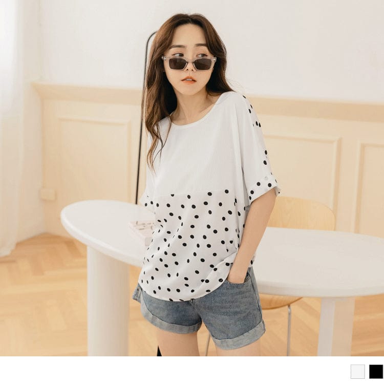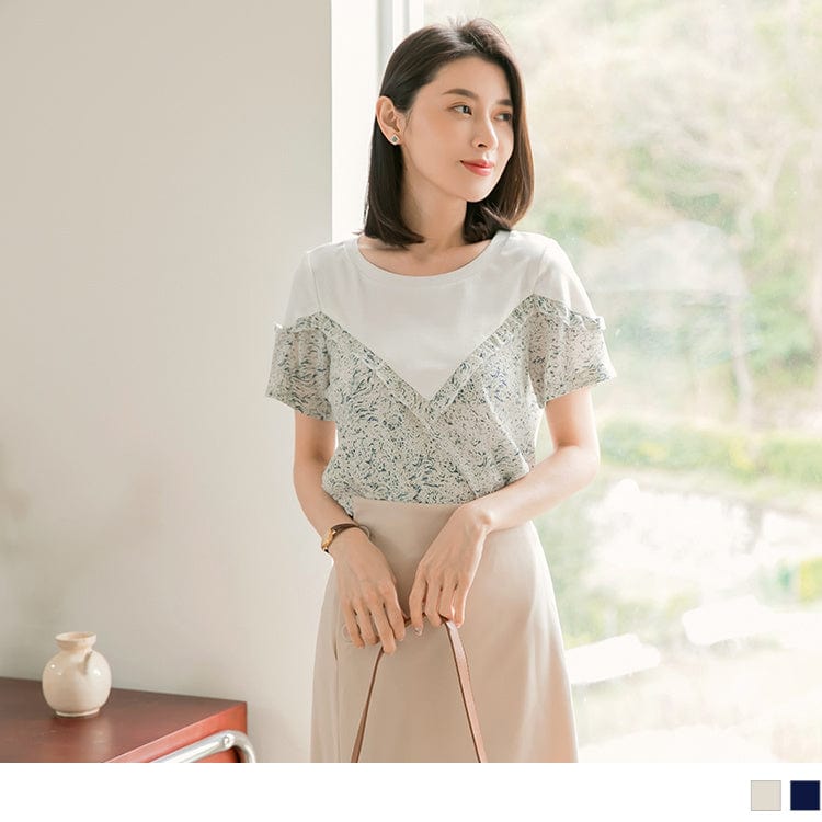 CHIFFON PATCHED SHORT SLEEVE ROUND NECK PRINTED TOPS
