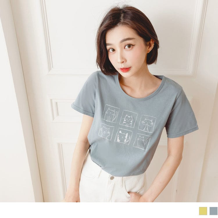 CAT PRINTED ROUND NECK SHORT SLEEVE COTTON TOPS