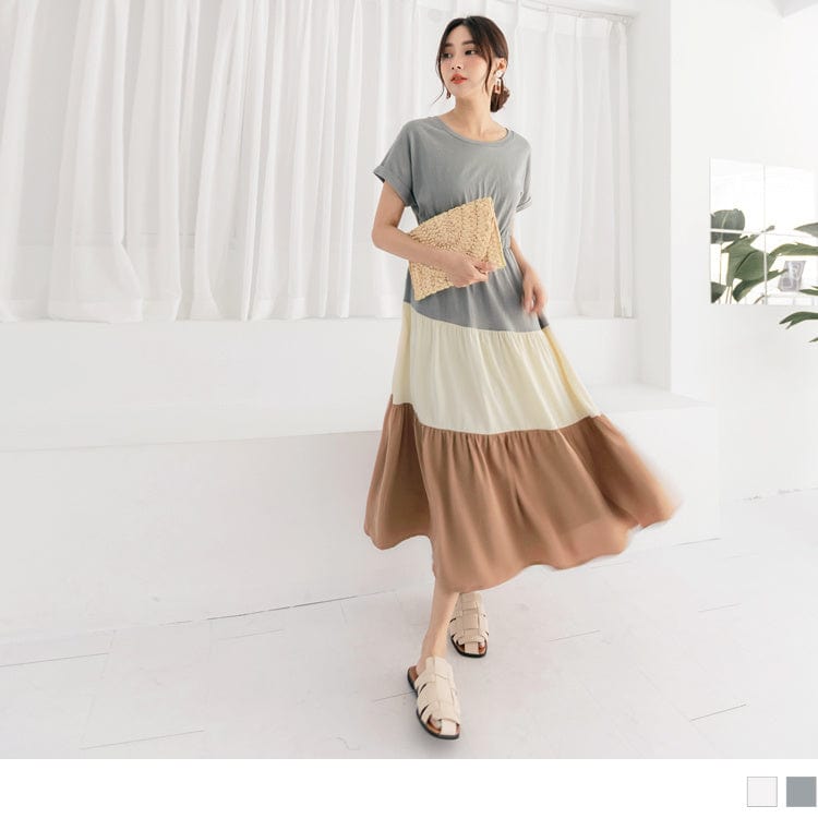 CONTRAST COLOR PATCHED A-LINE MAXI DRESS