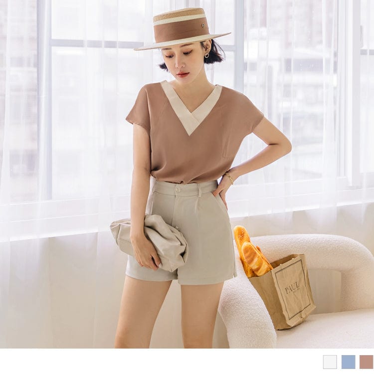 CONTRAST COLOR V-NECK SHORT SLEEVE CHIFFON TOPS