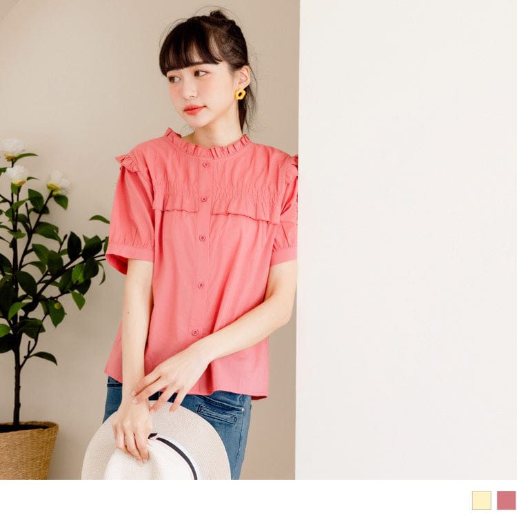 COTTON BUTTON RUFLLE COLLAR PUFF SLEEVE TOPS