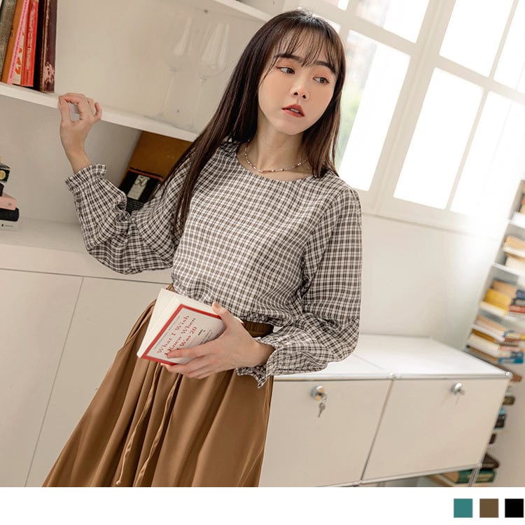 CHECKED RUFFLE PUFF SLEEVE ROUND-NECK TOPS