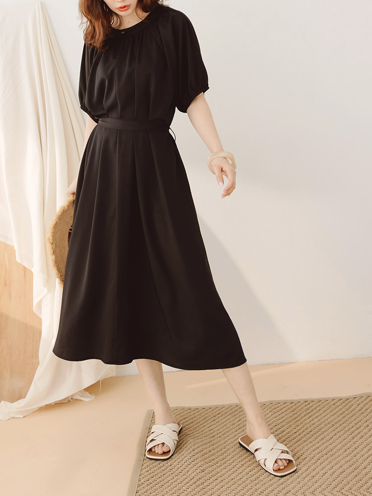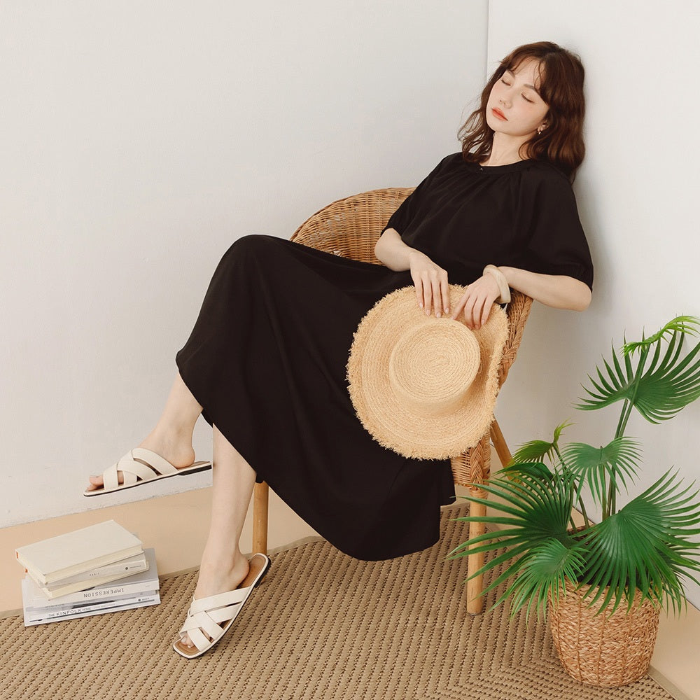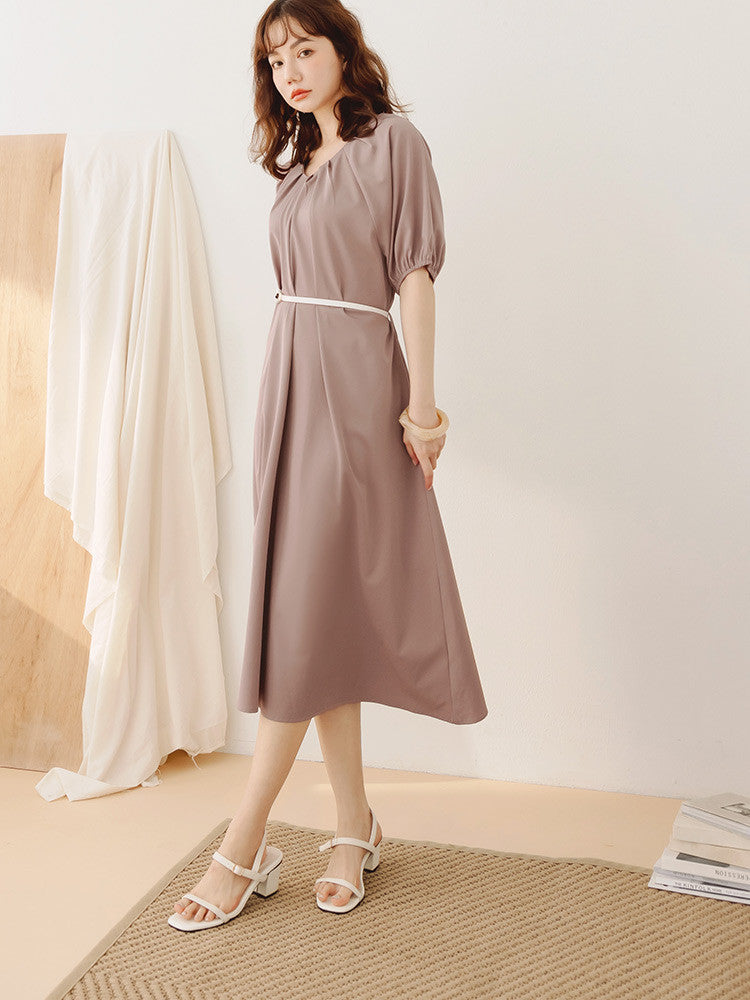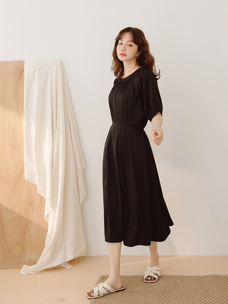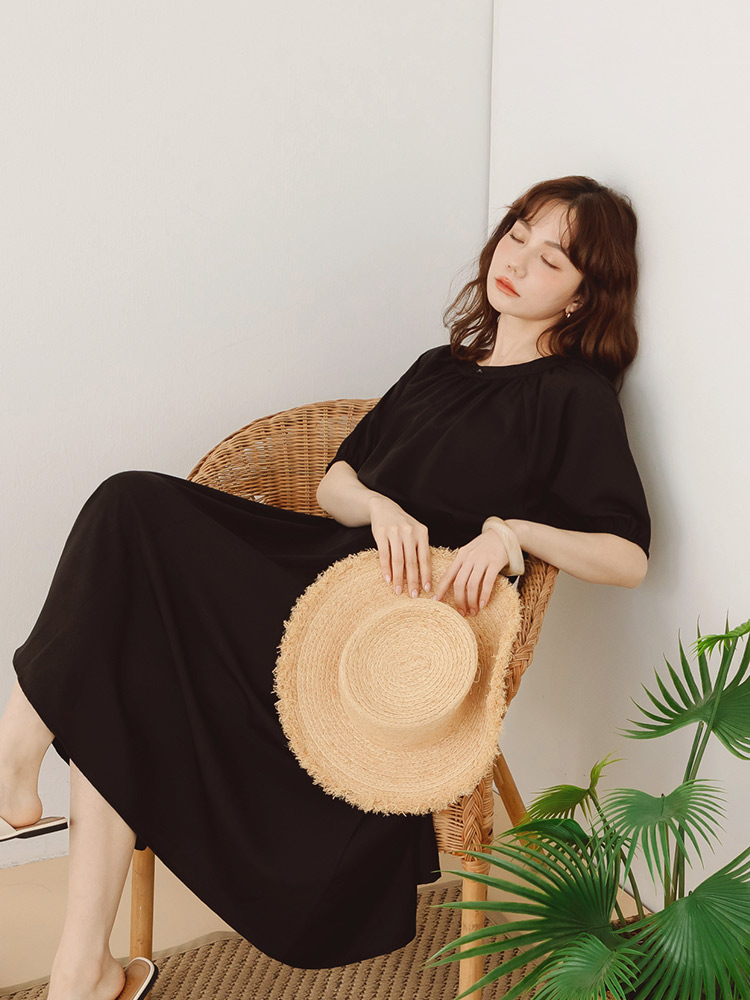 Basic Solid Plain Puff Sleeve Long Summer Dress
