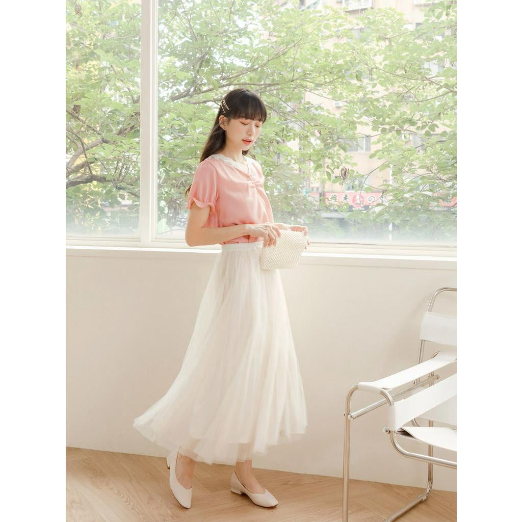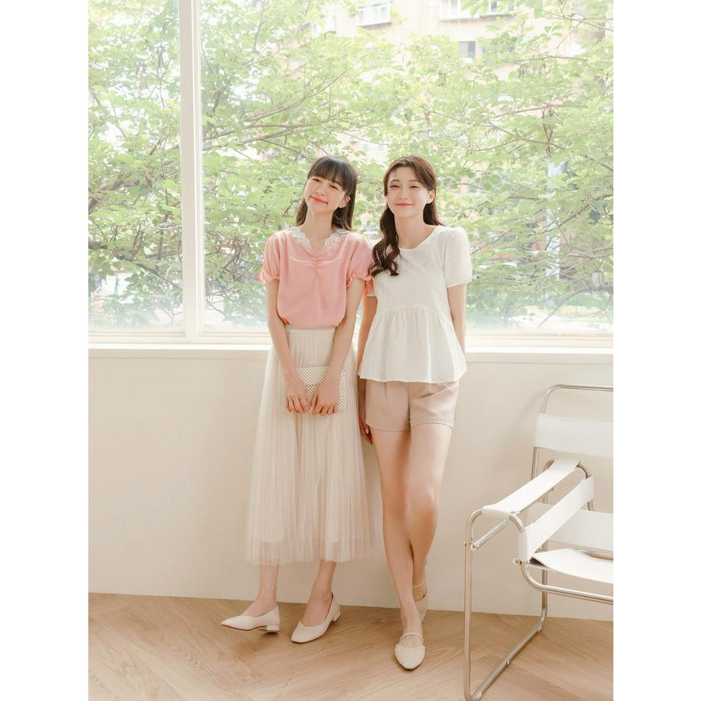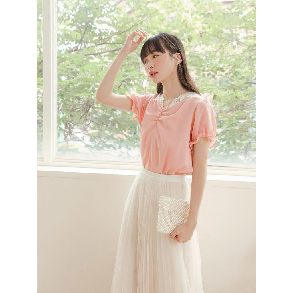 Eyelet Lace Embroidery Ruched Puff Sleeve Top