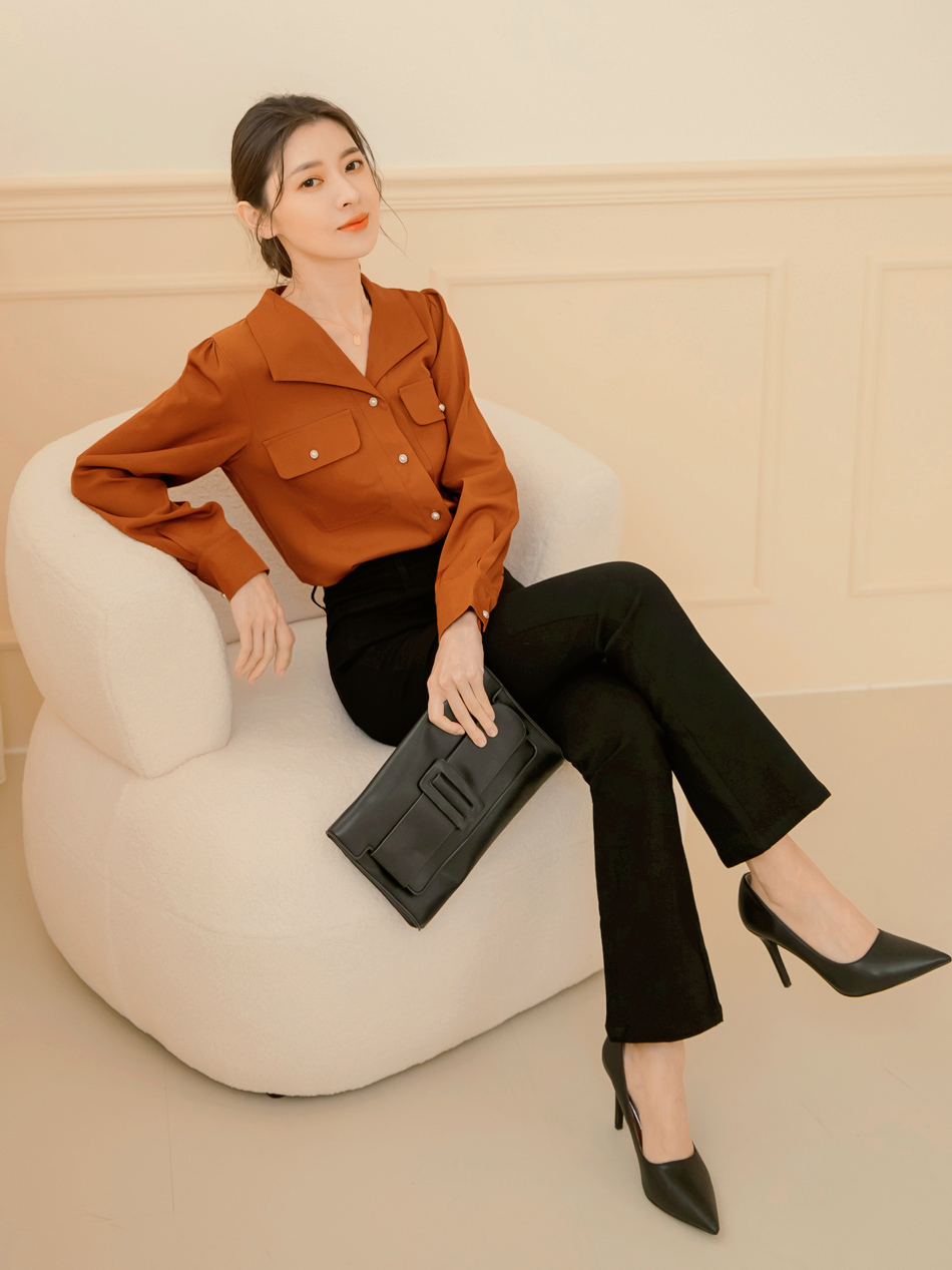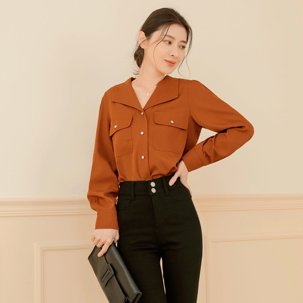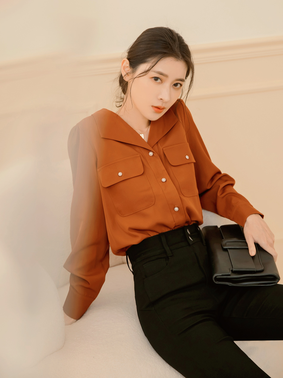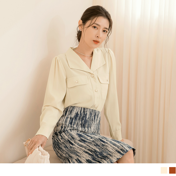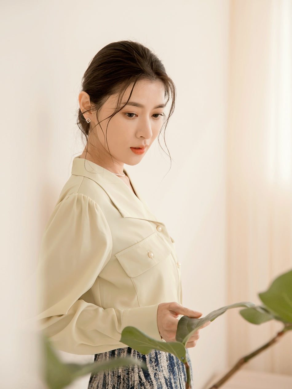 French Pearl Button Pocket Pleated Sleeve Chiffon Top