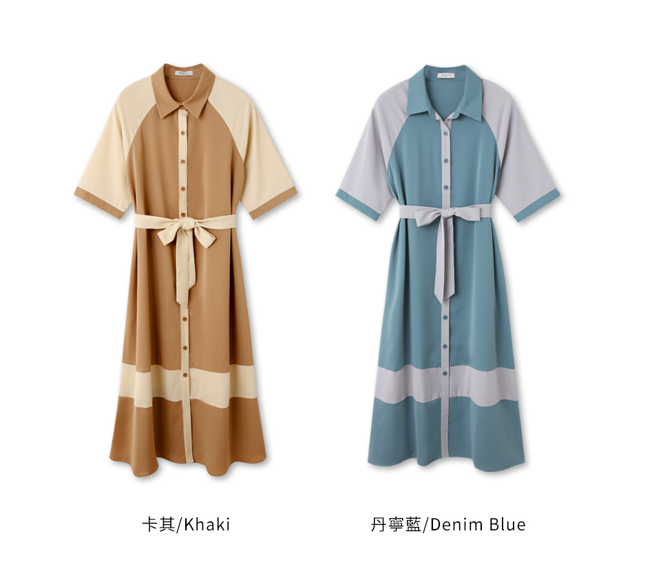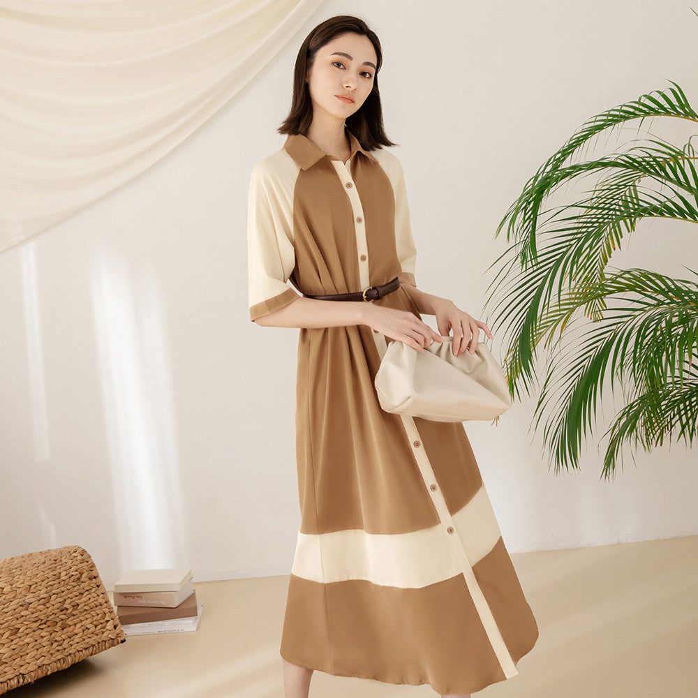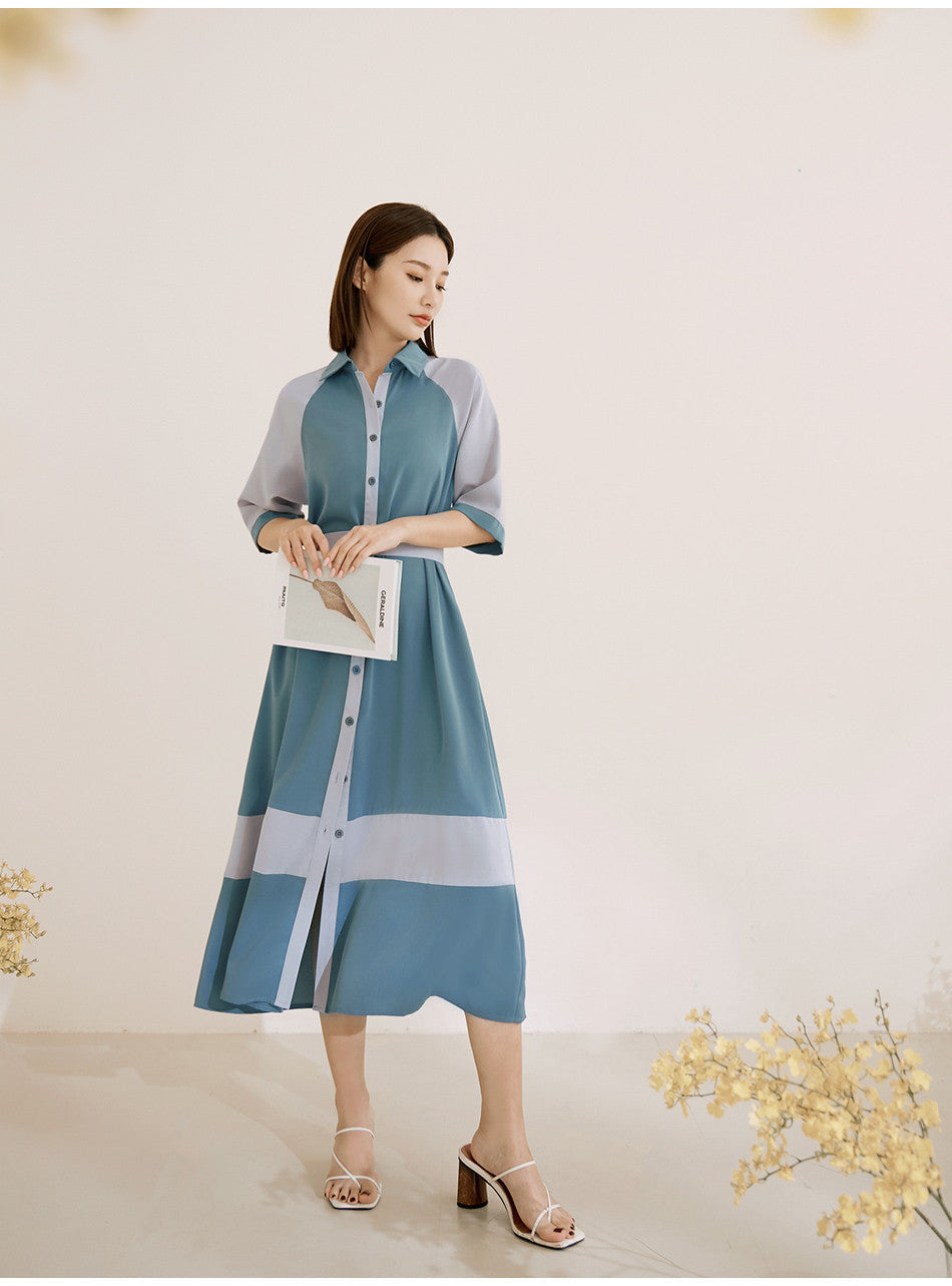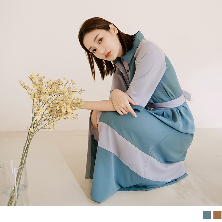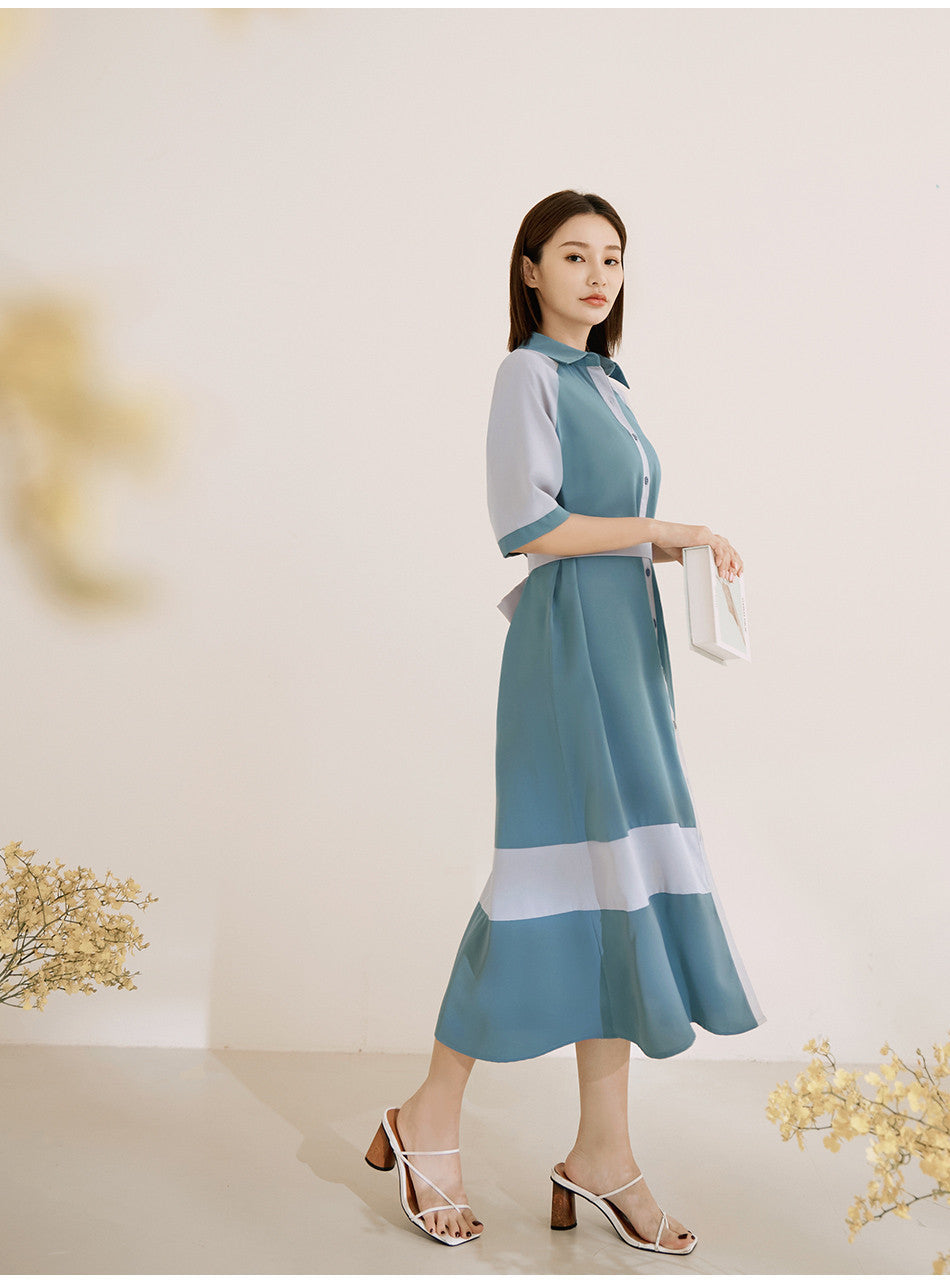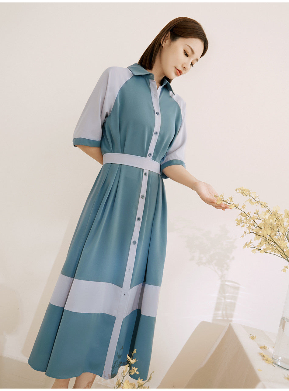 Korean Colorblock Short Sleeve Long Maxi Belt Shirt Dress