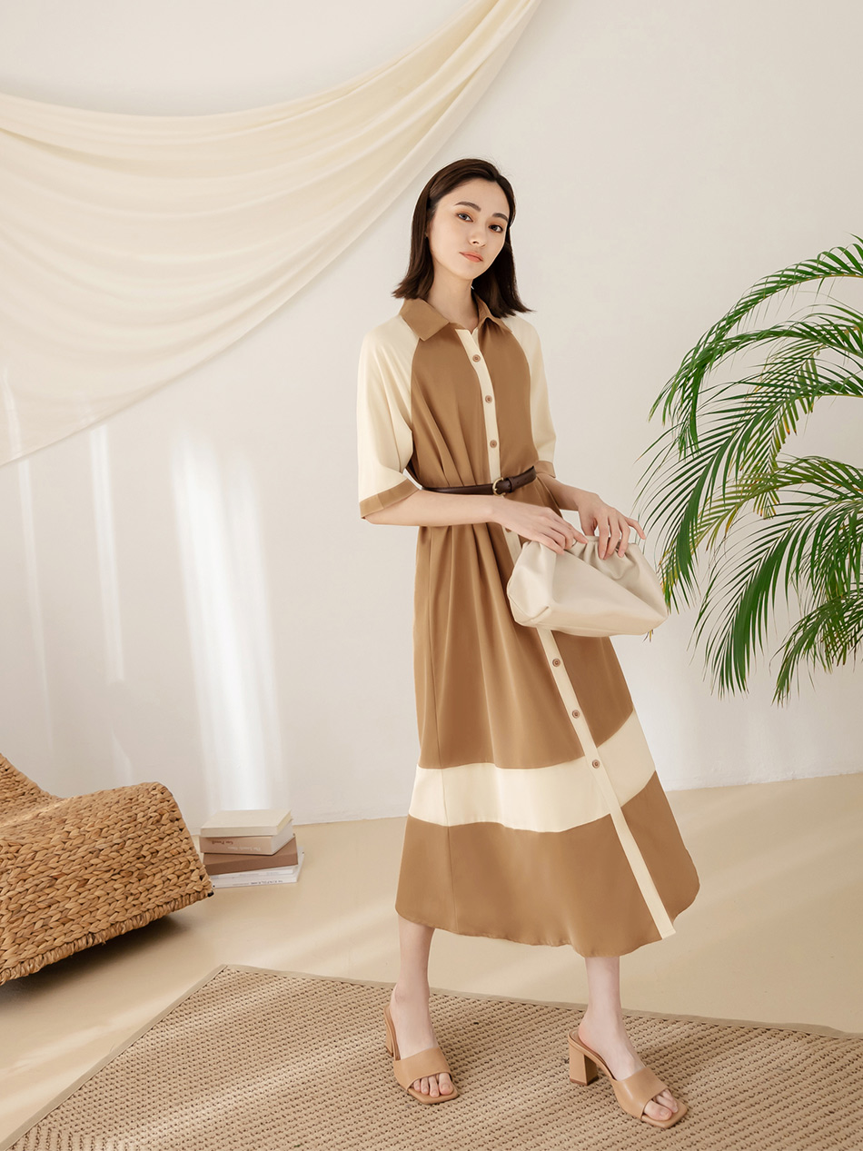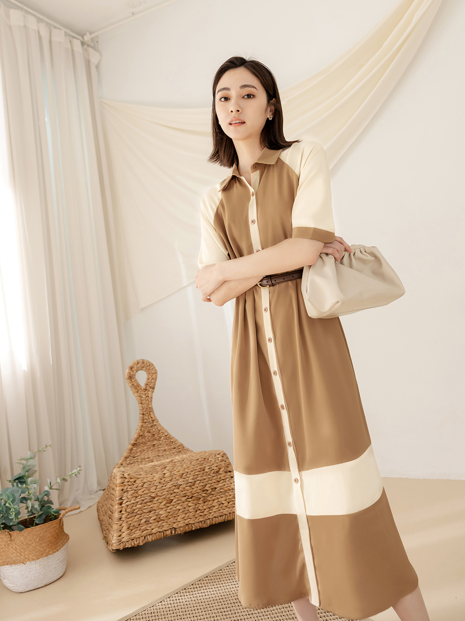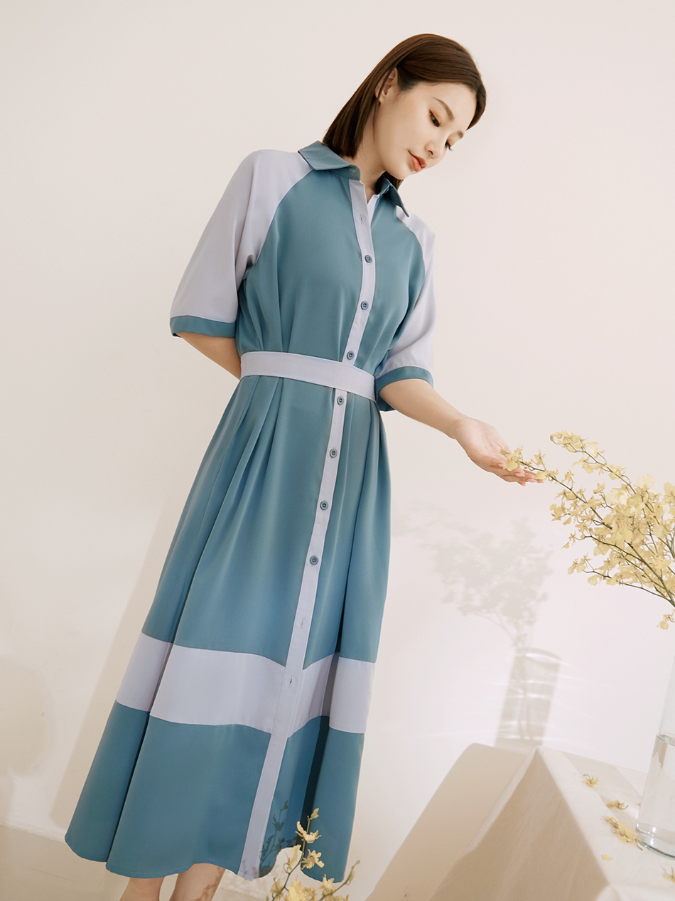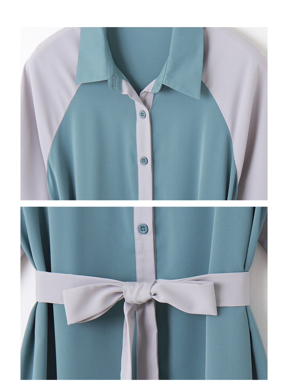 Korean Colorblock Short Sleeve Long Maxi Belt Shirt Dress
