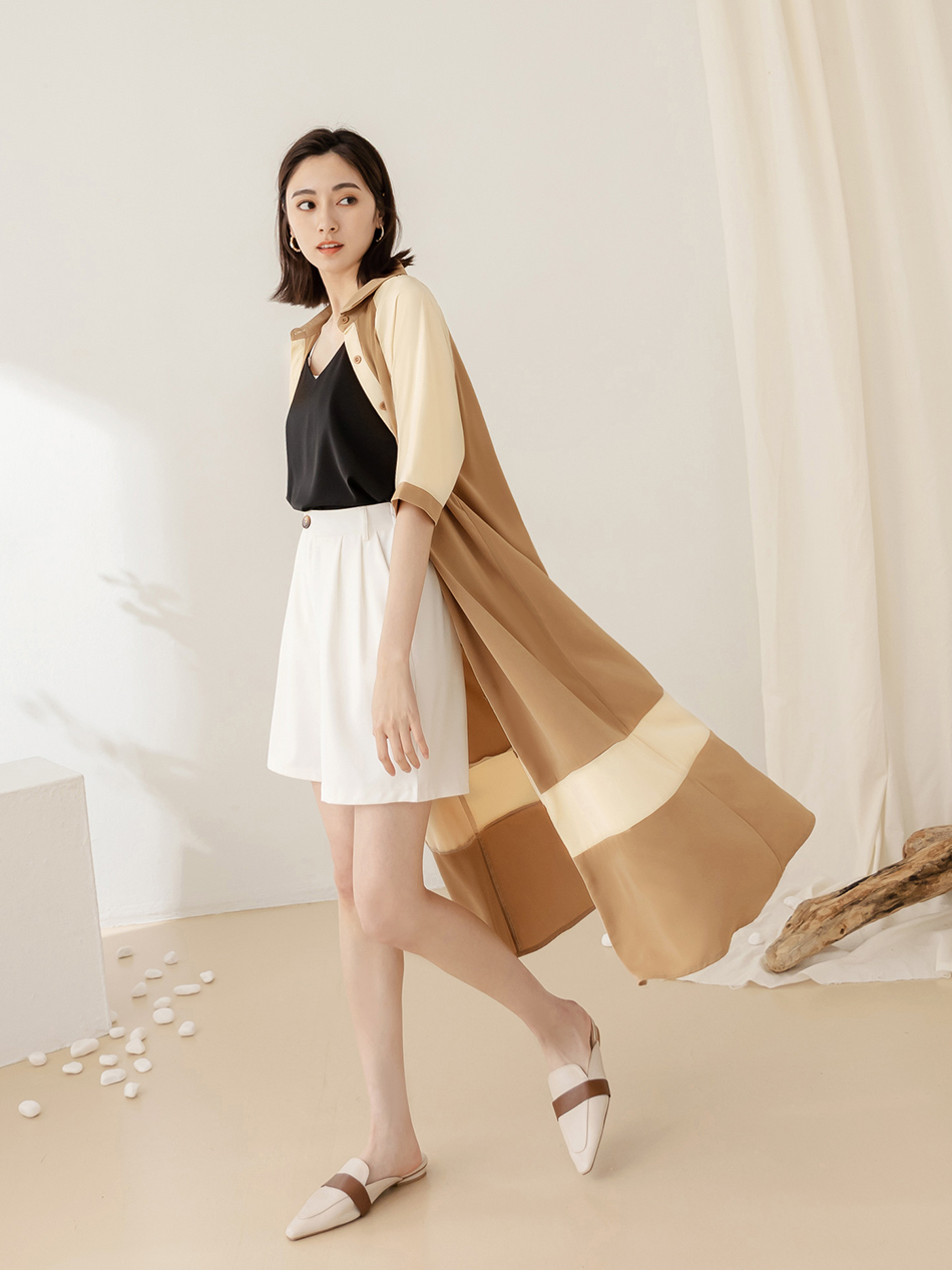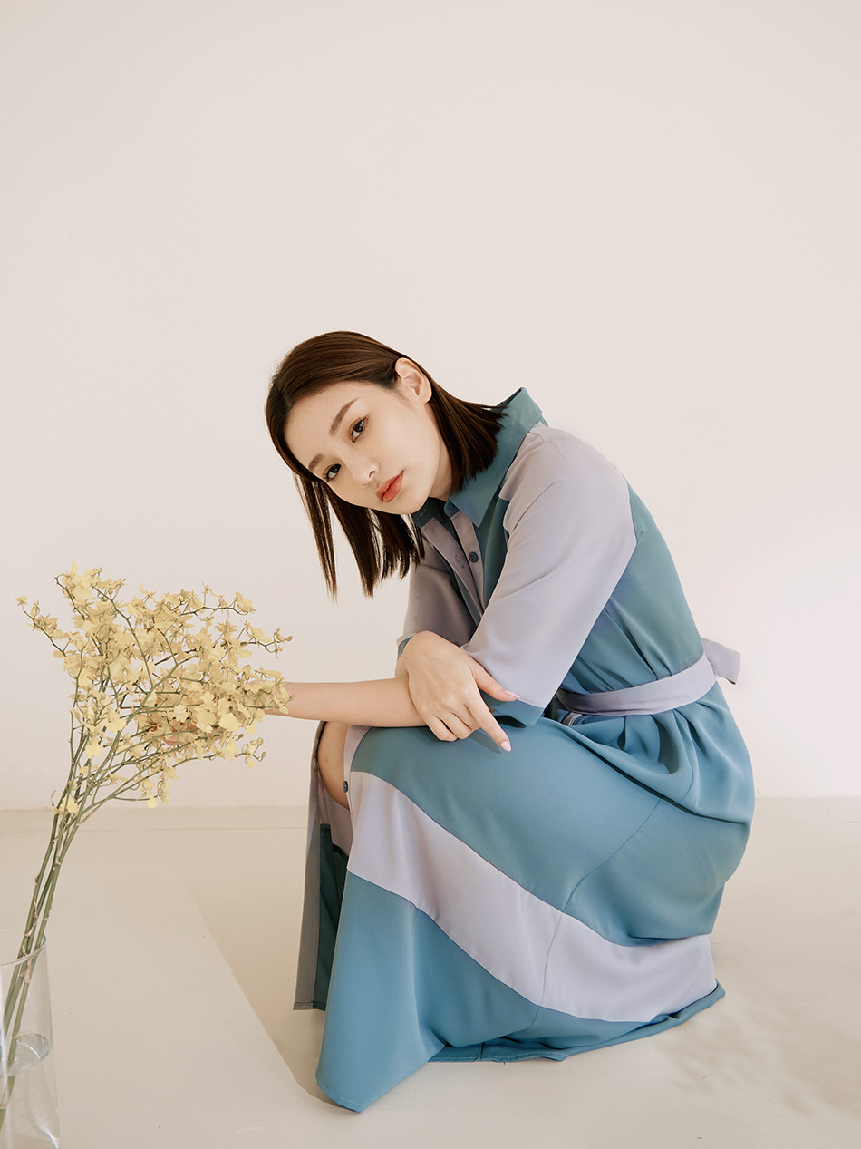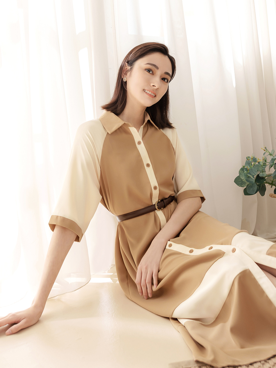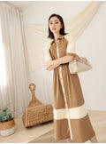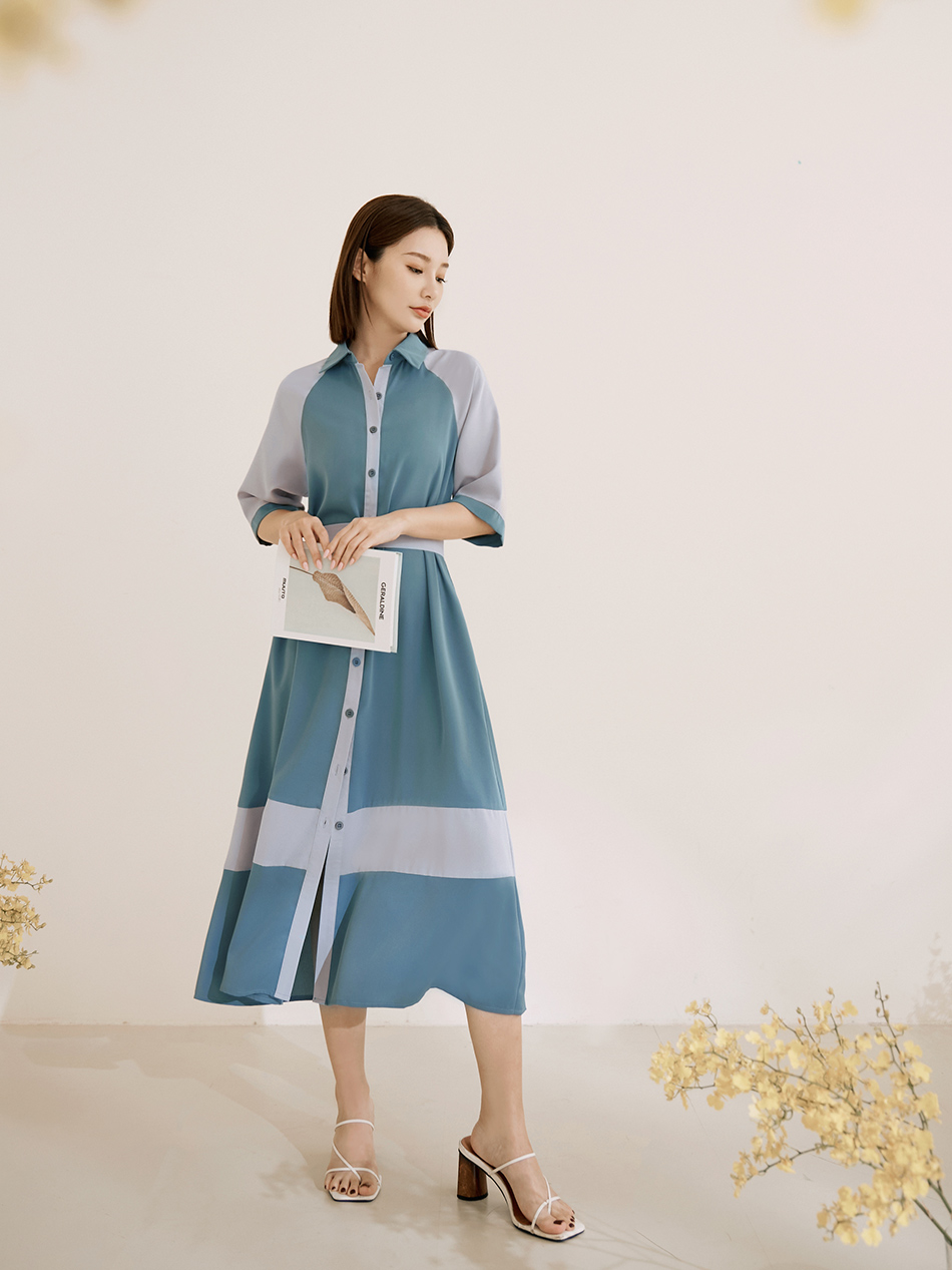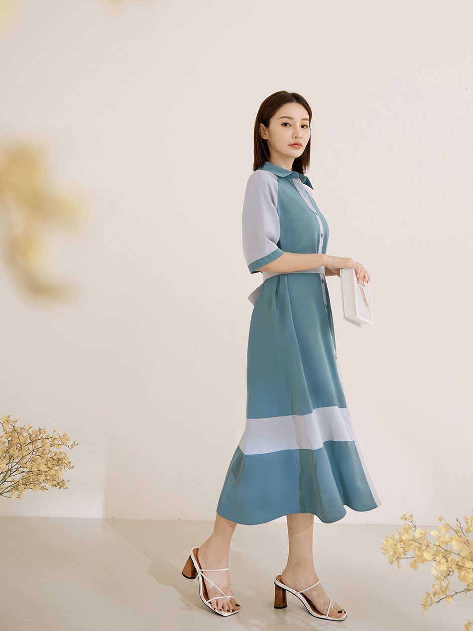 Korean Colorblock Short Sleeve Long Maxi Belt Shirt Dress