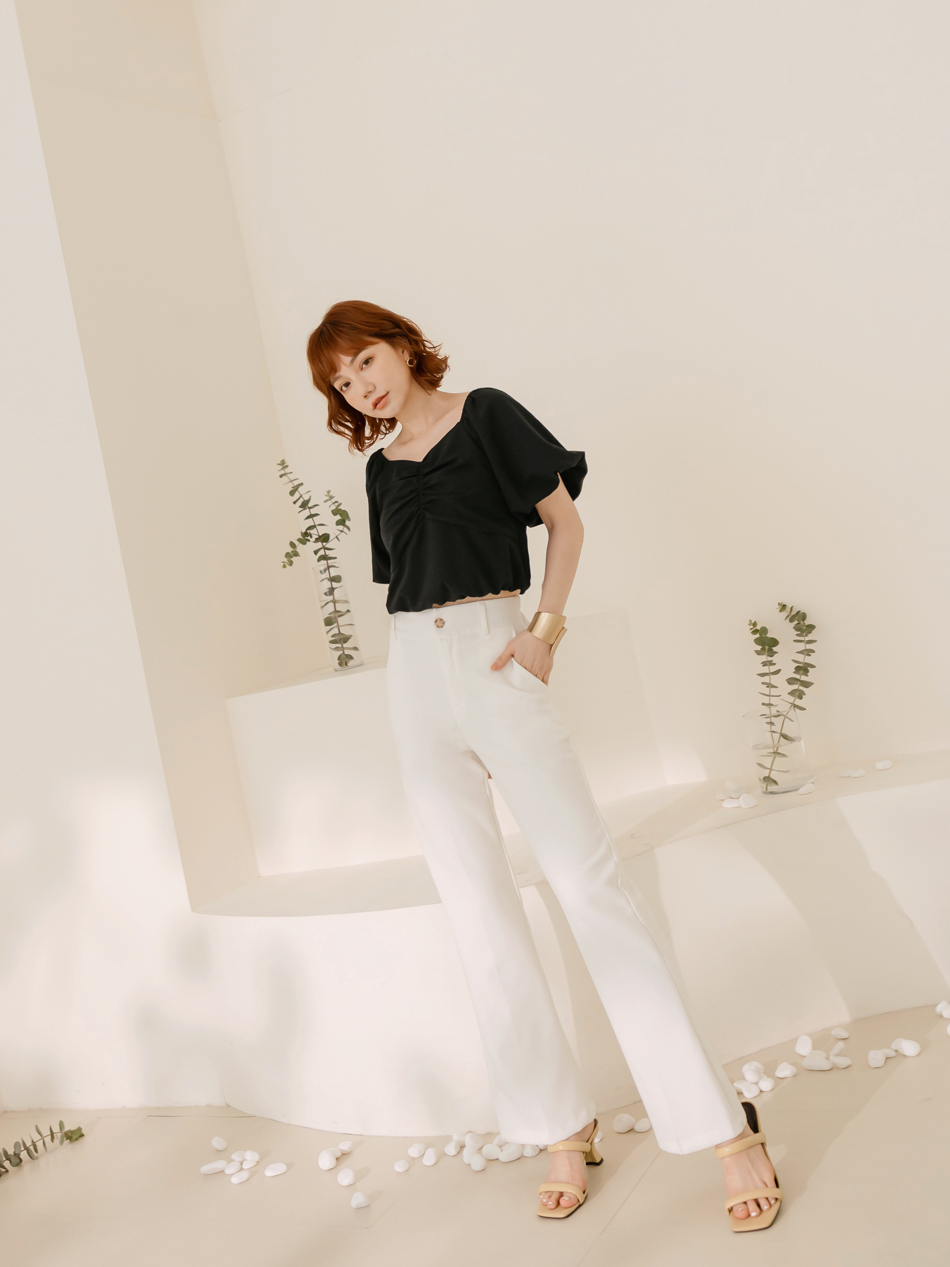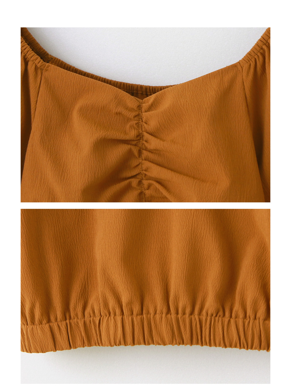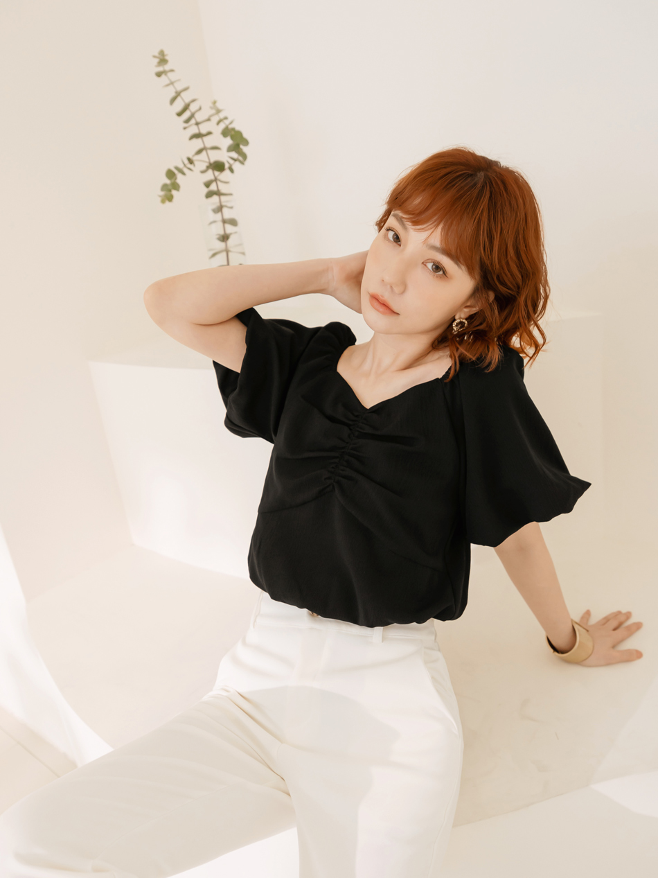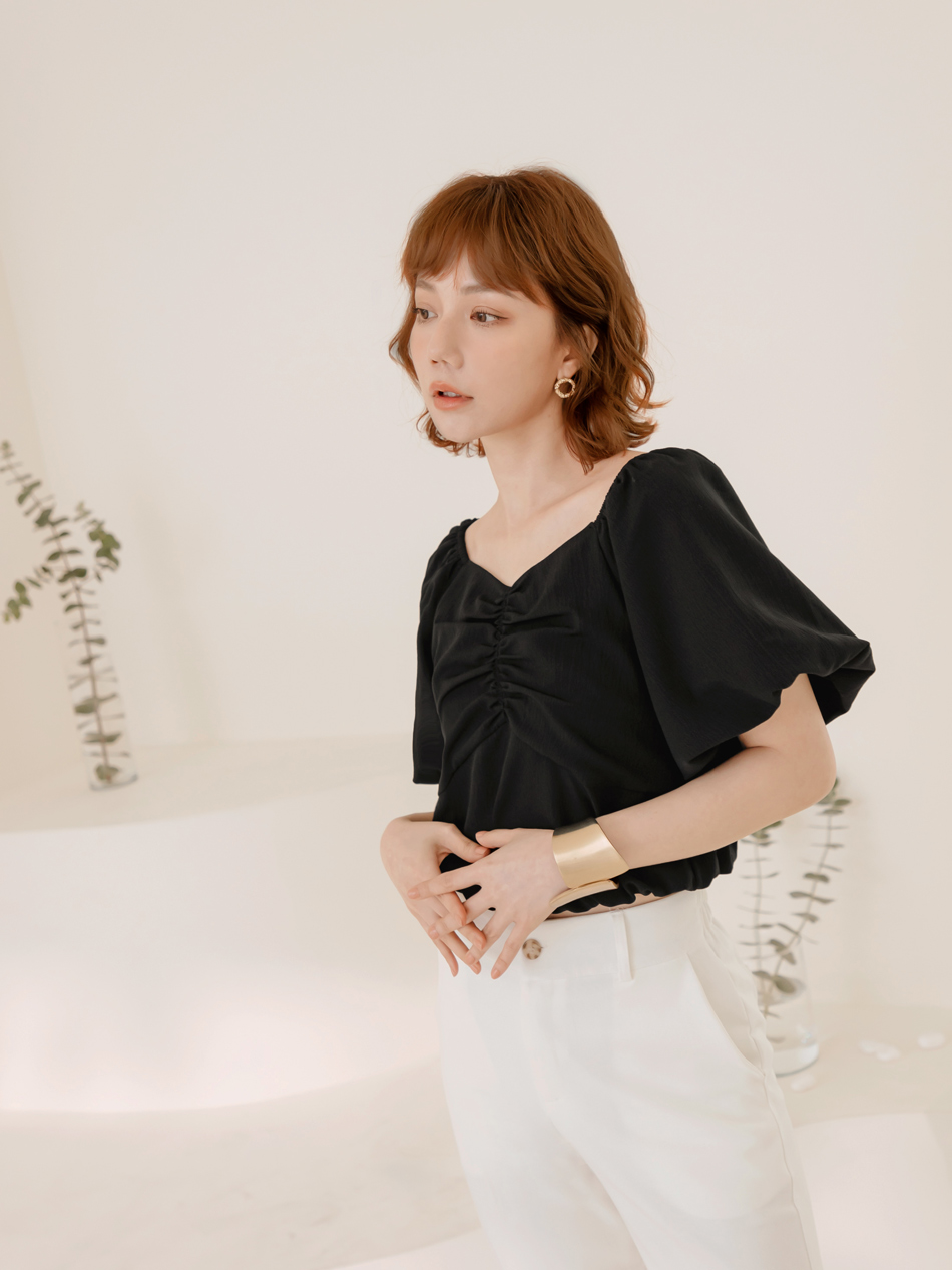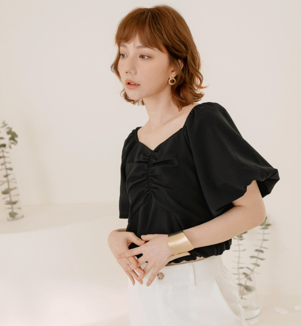 Korean Wrinkle Free Ruched Crop Puff Sleeve Blouse Top