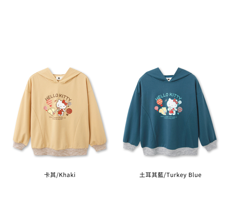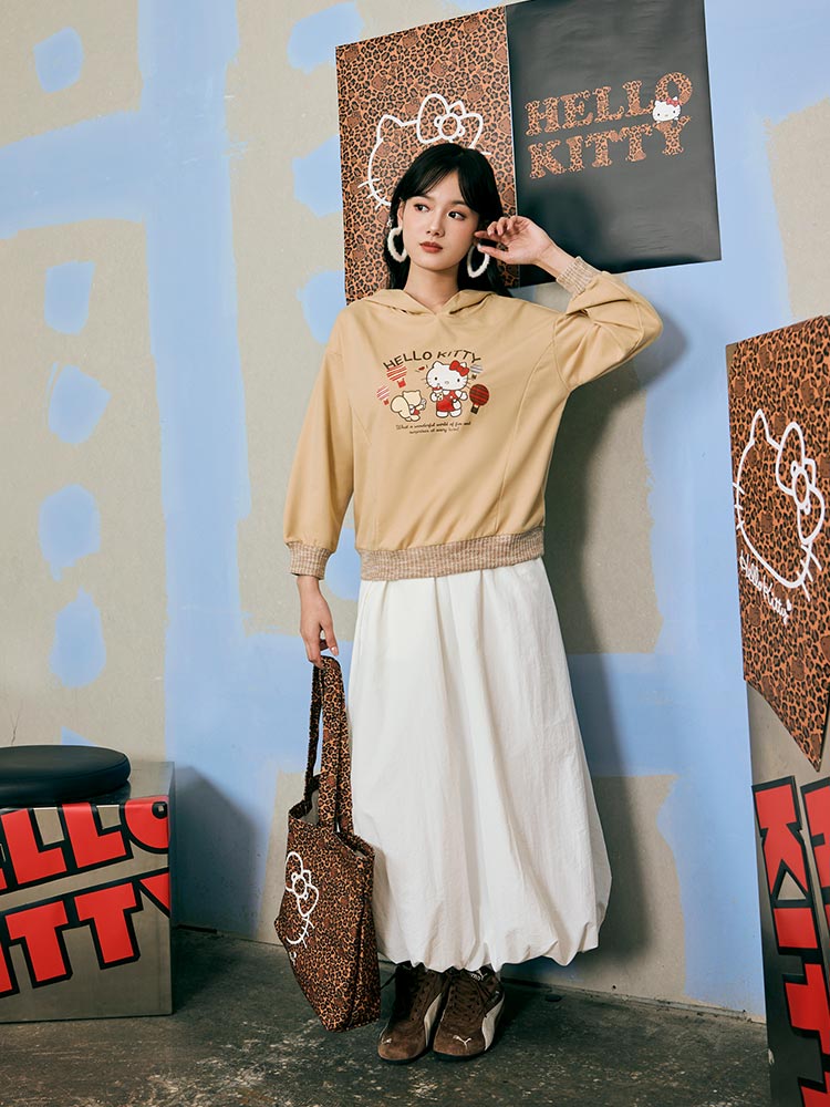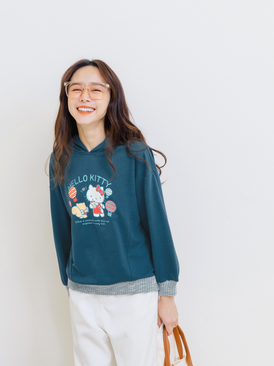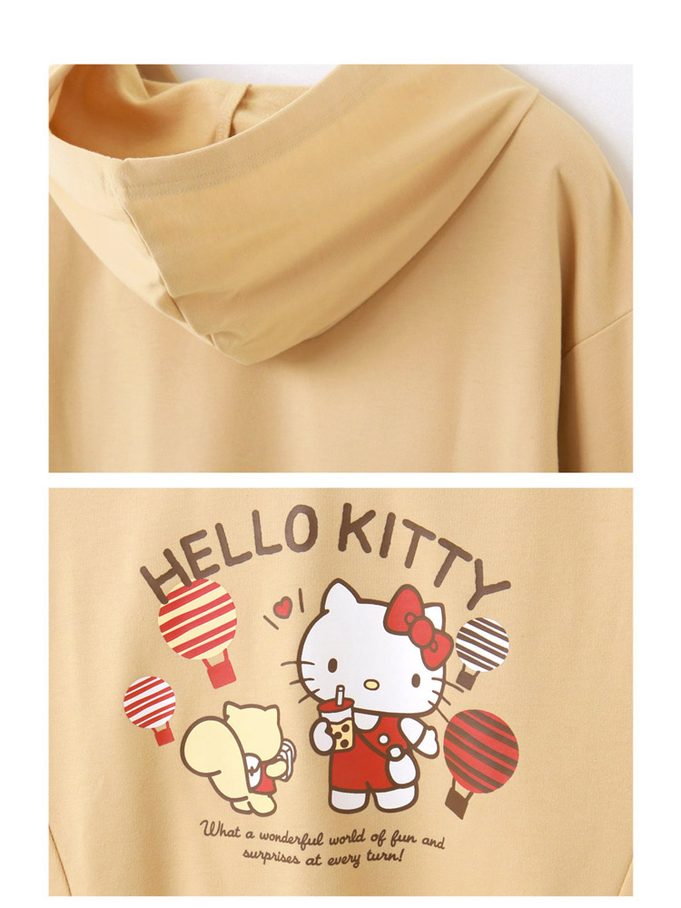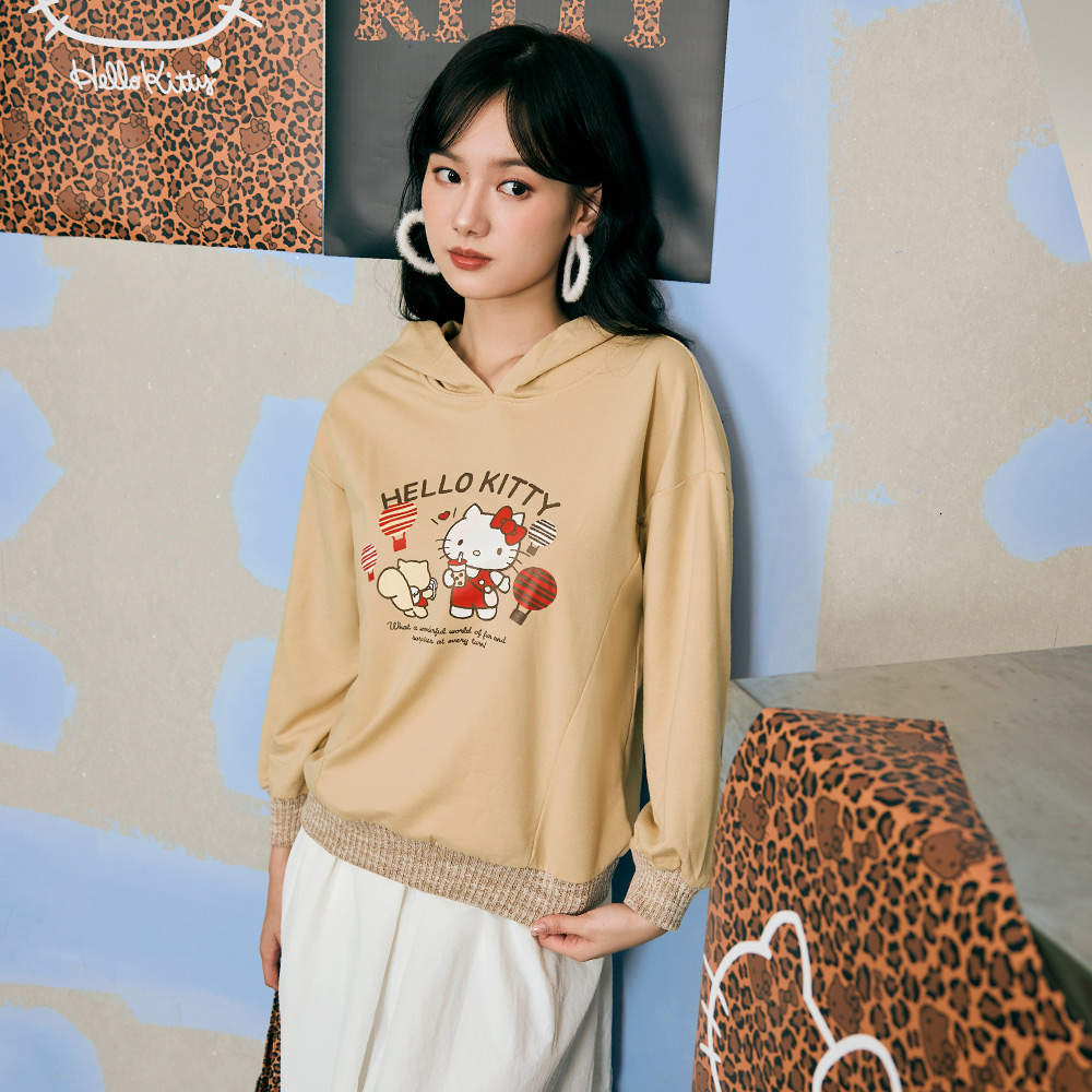 KITTY PRINTED RIB LONG SLEEVE HOODED TOPS