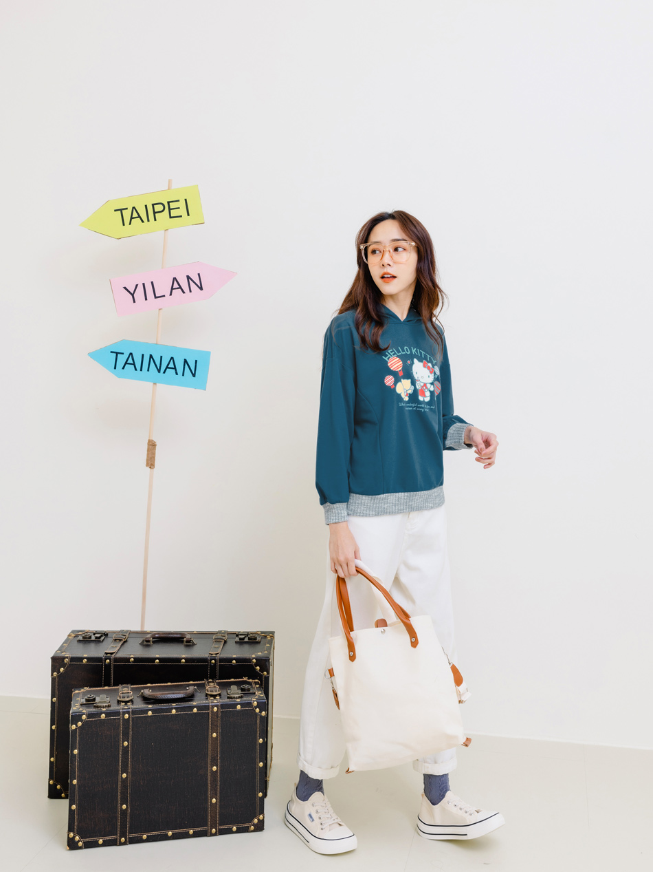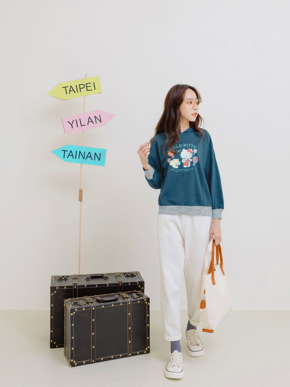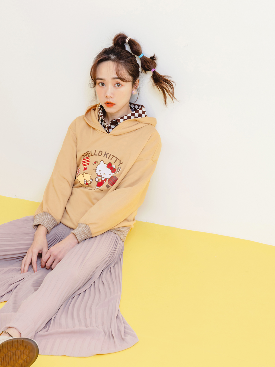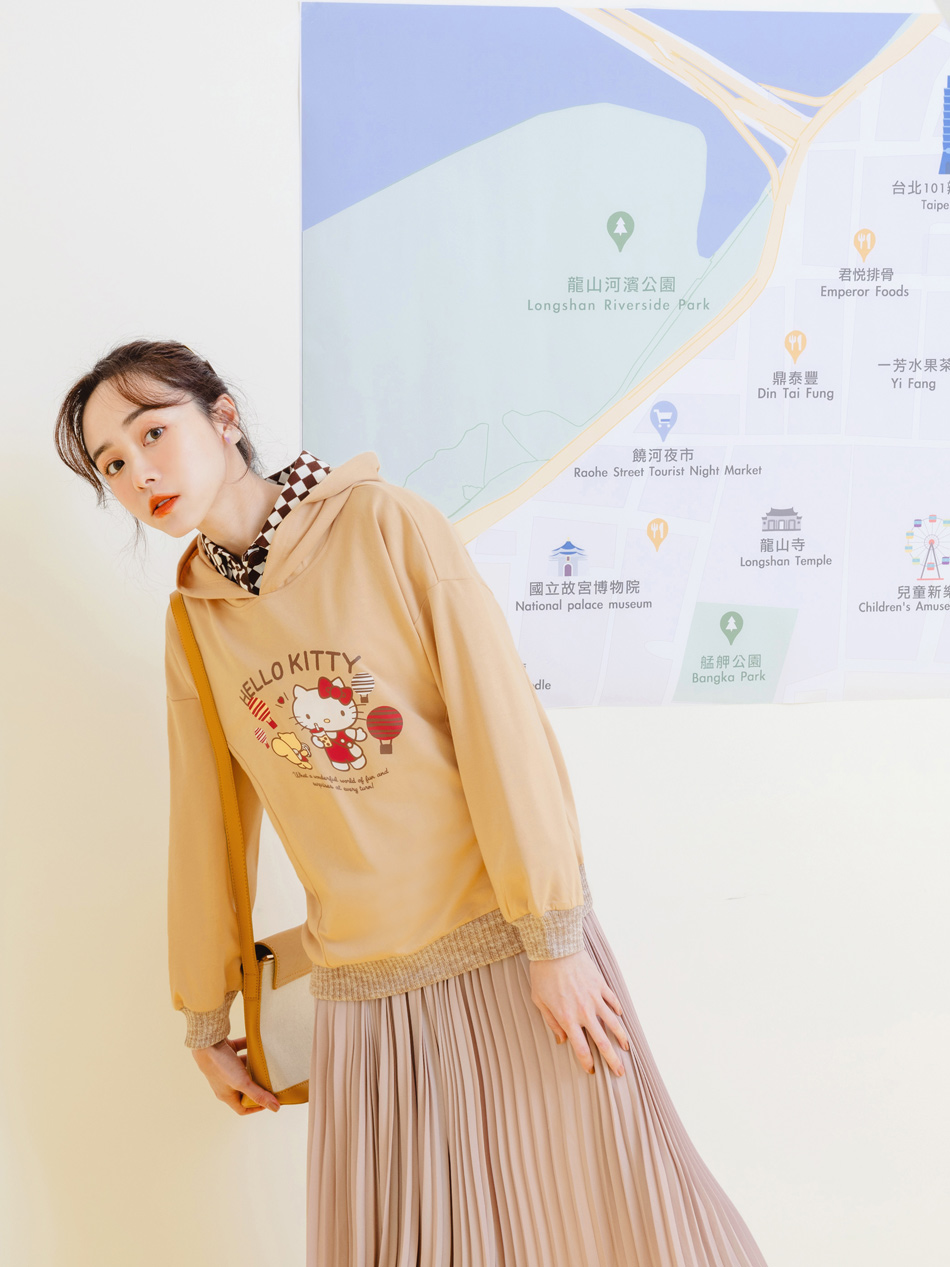 KITTY PRINTED RIB LONG SLEEVE HOODED TOPS