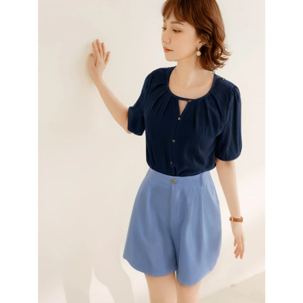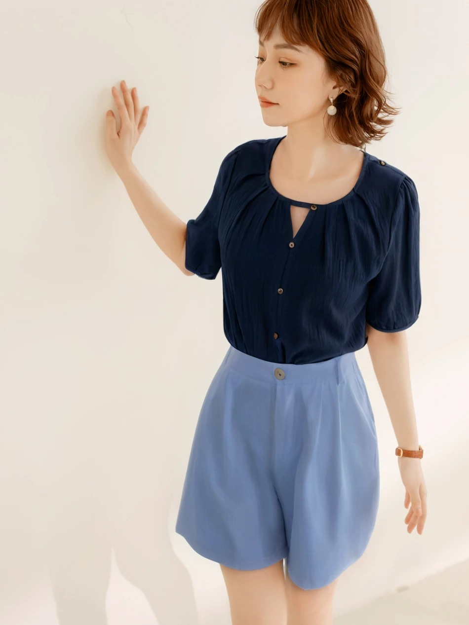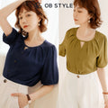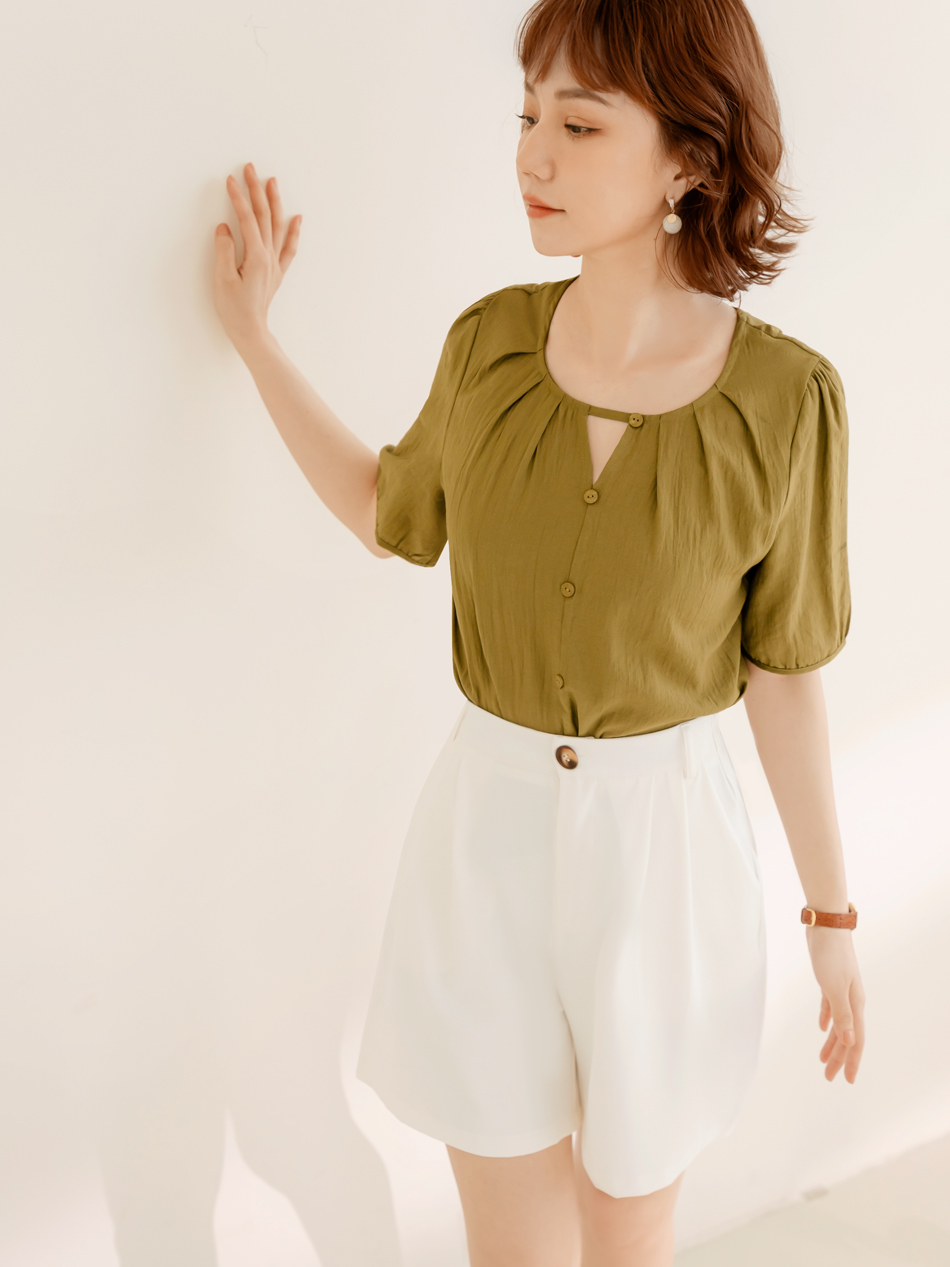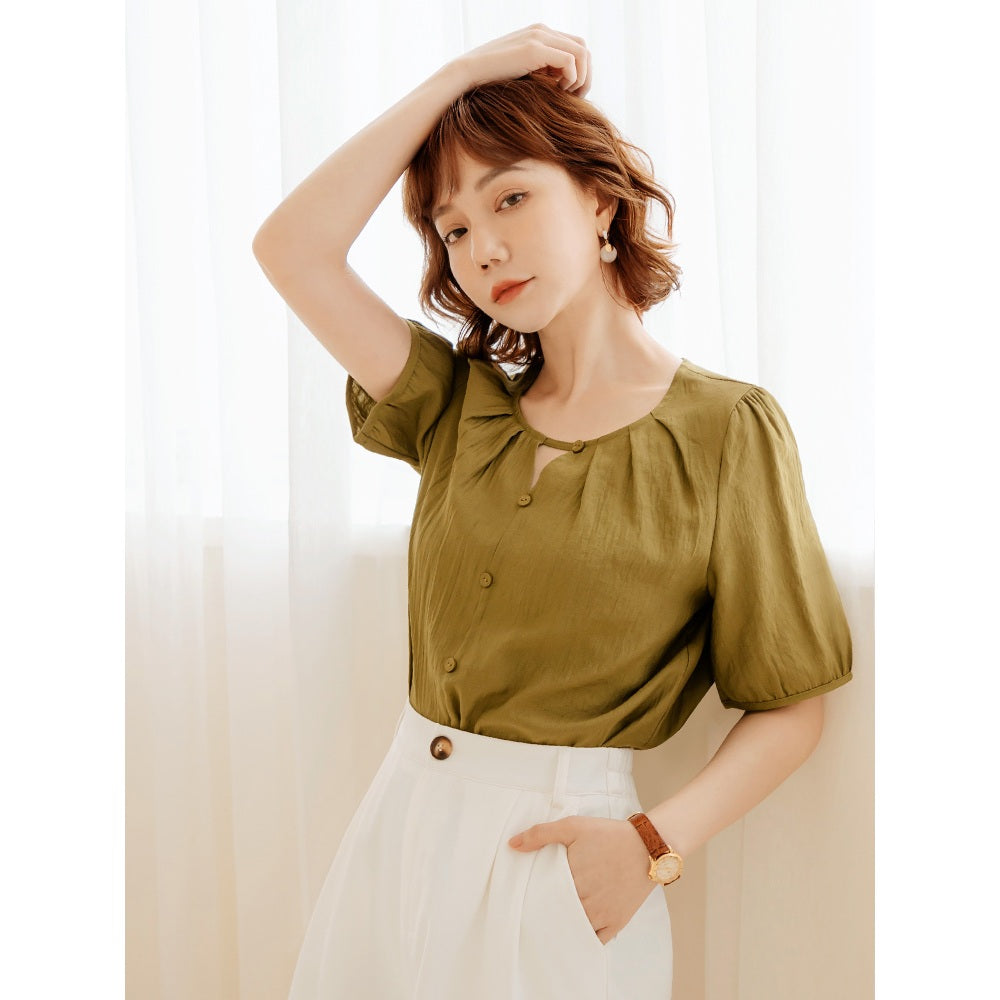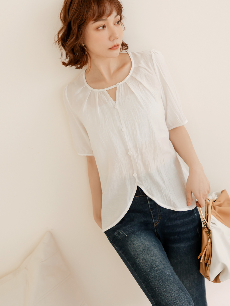 Weekend X Ob Design Women Casual Cutout Button Round Neck Pleated Short Sleeve Shirt Top Plus Size