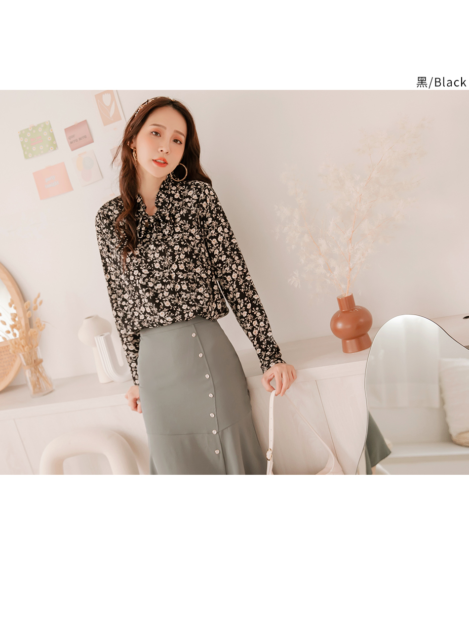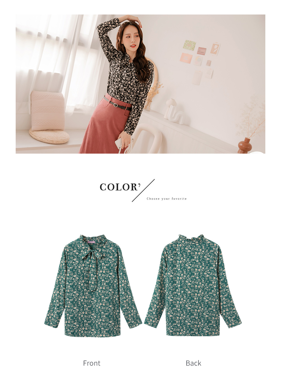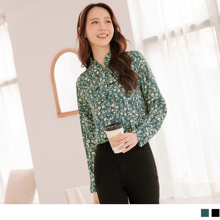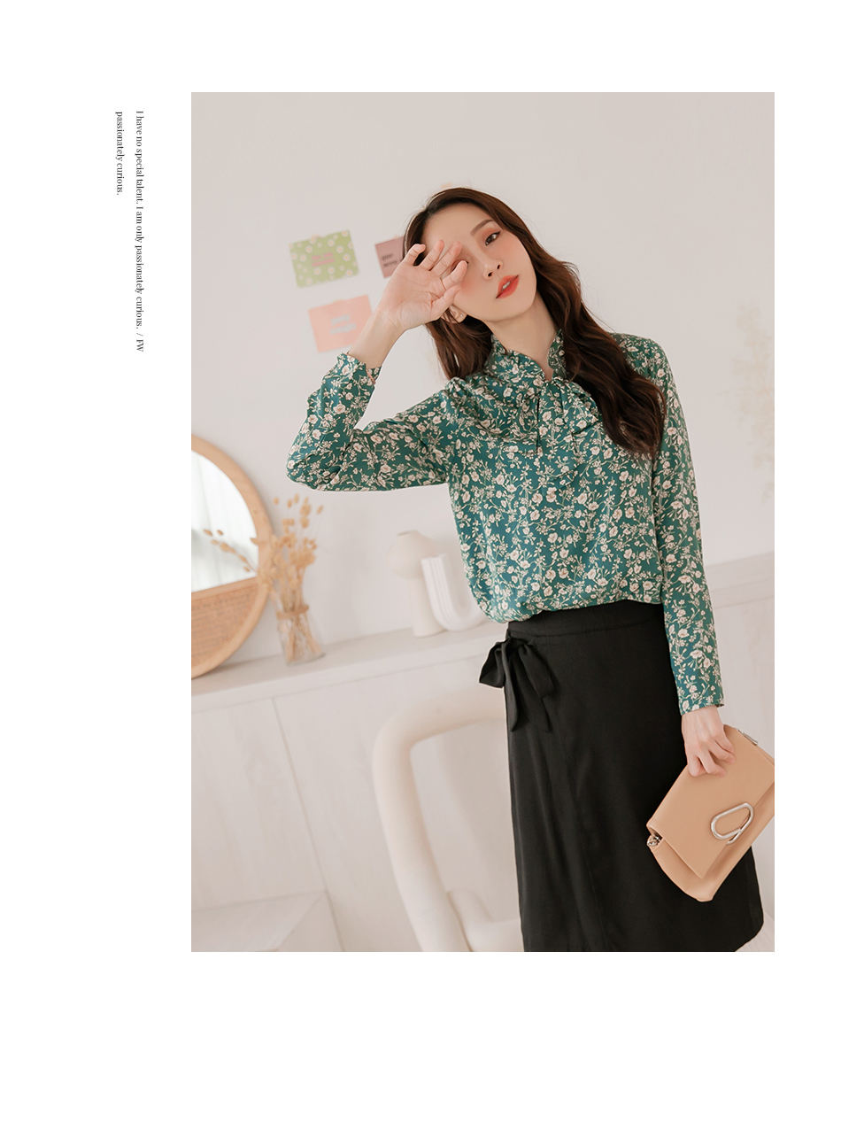 Work Floral Ruffled Stand Collar Tie Blouse/Top