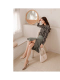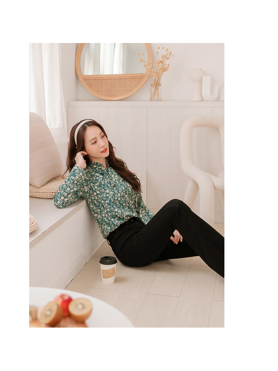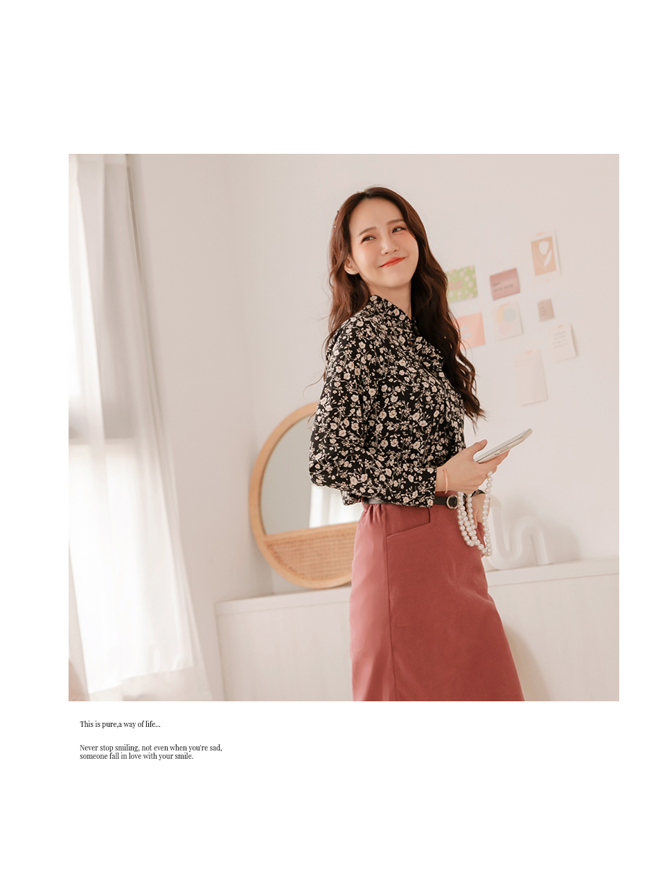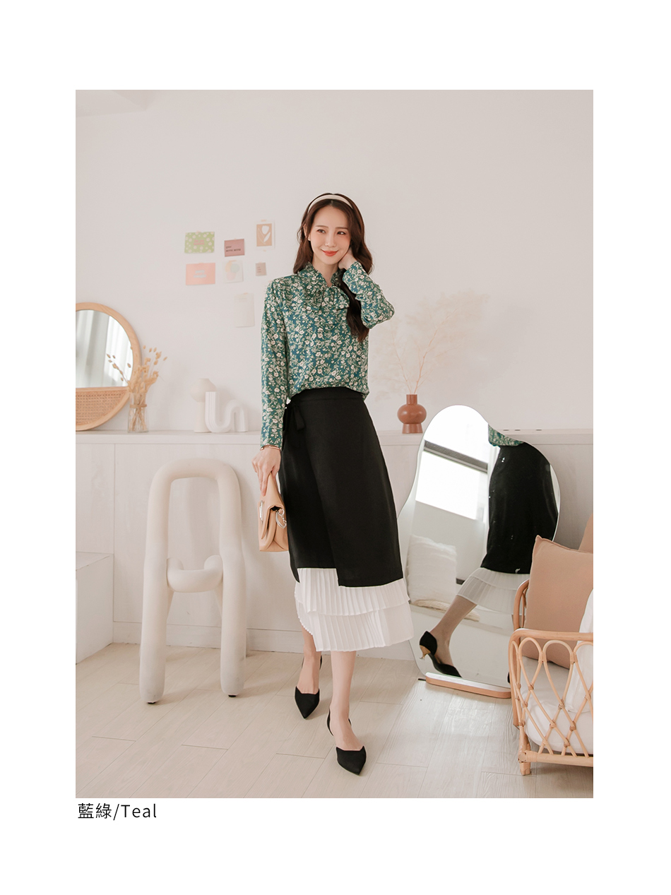 Work Floral Ruffled Stand Collar Tie Blouse/Top